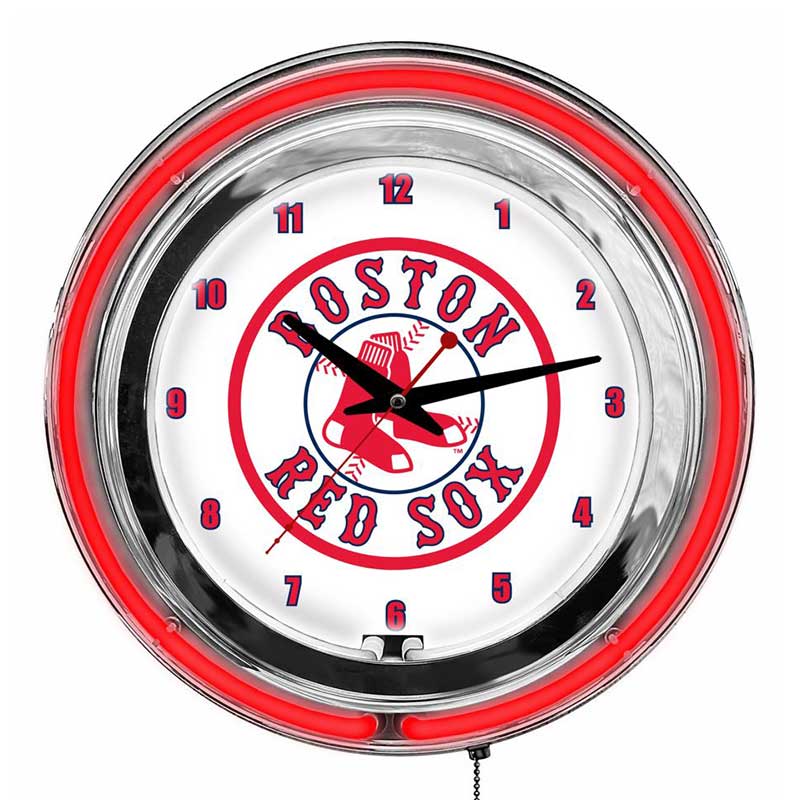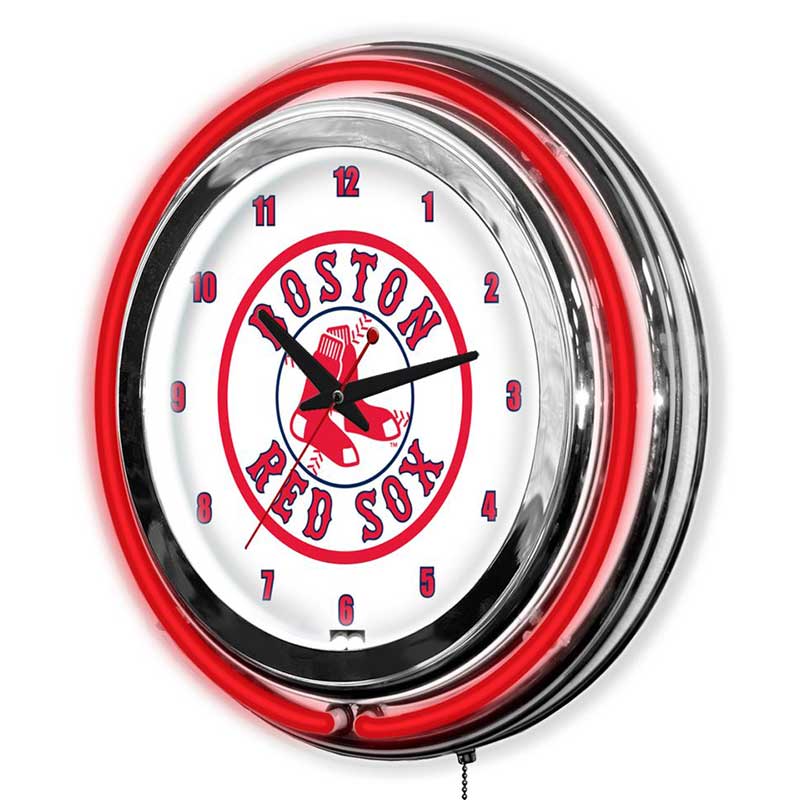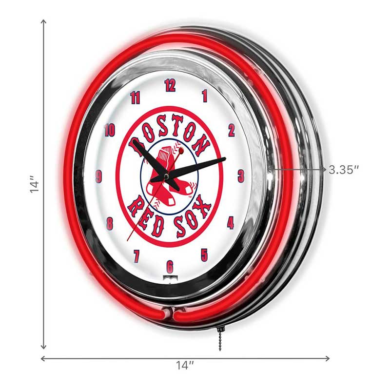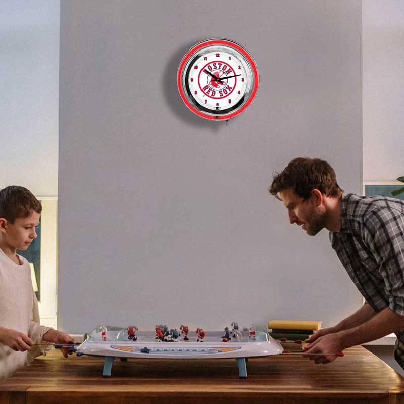 - Neon Lighting: Features bright red and navy blue neon lights surrounding the clock face, illuminating the Red Sox logo for added visual impact.