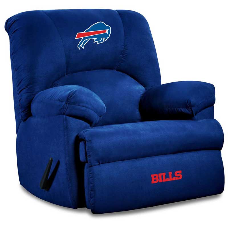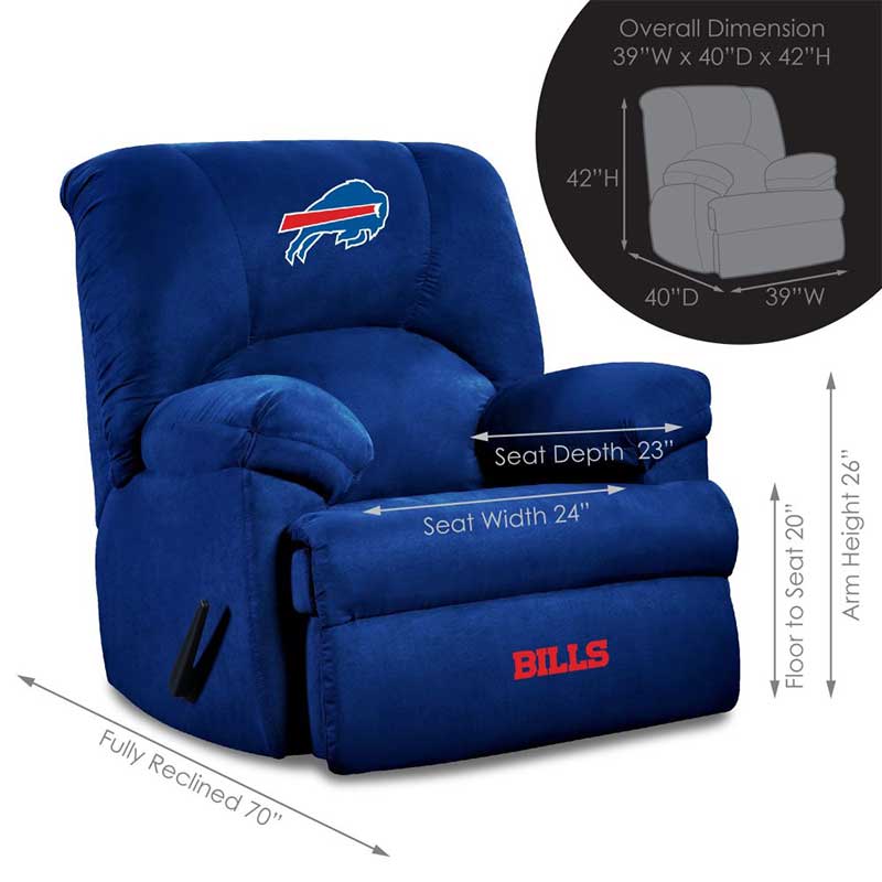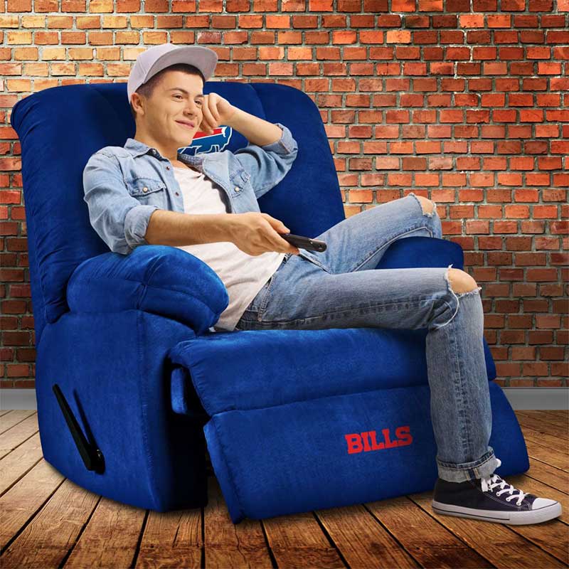 Watch the Big Game in complete comfort with the Buffalo Bills GM Recliner. Bring home-field advantage to any room of the house with durable, vibrant microfiber fabric decked out with an embroidered logo on the headrest and ottoman. Enjoy this rocker recliner, fit to for the fan up to 6 foot tall. A kiln-dried hardwood and cross-banded plywood frame make this chair as sturdy as it is comfortable. Product is officially licensed by the NFL and is made in the USA.