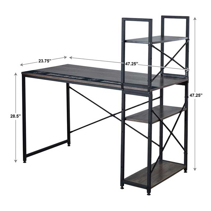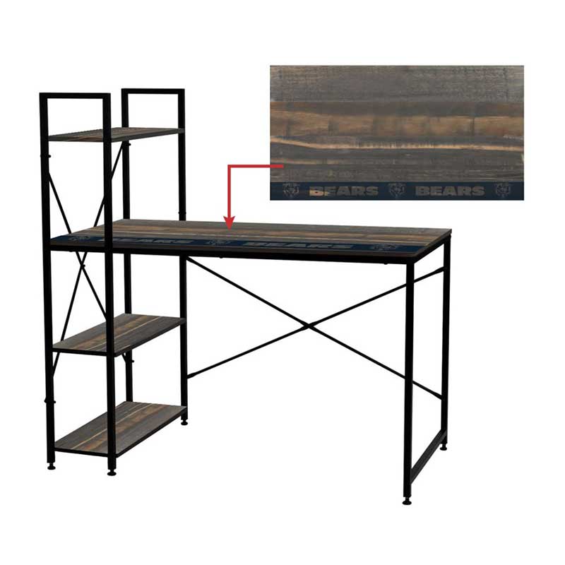 Customize your “Chicago Bears” workspace with this great space saving desk with exclusive shelf design system. This desk’s unique design lets you customize shelves below and above the desk surface and gives you plenty of space to stay organized. This industrial type look with a reclaimed desk top laminate blends well in all types of room decor. Perfect for writing and for use as a computer workstation