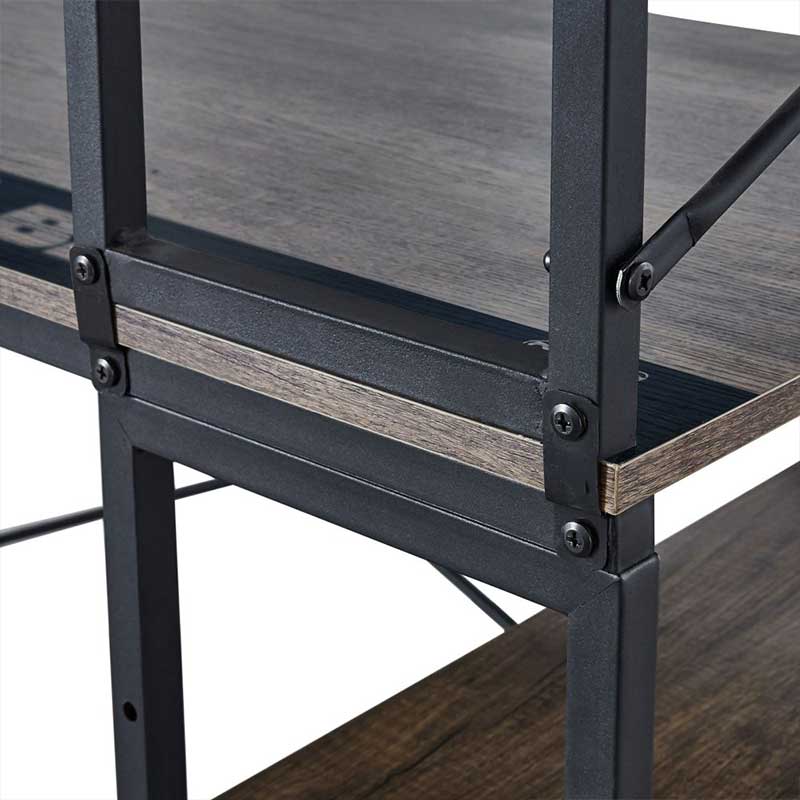- Desk top is an attractive reclaimed looking rough hewn wood laminate