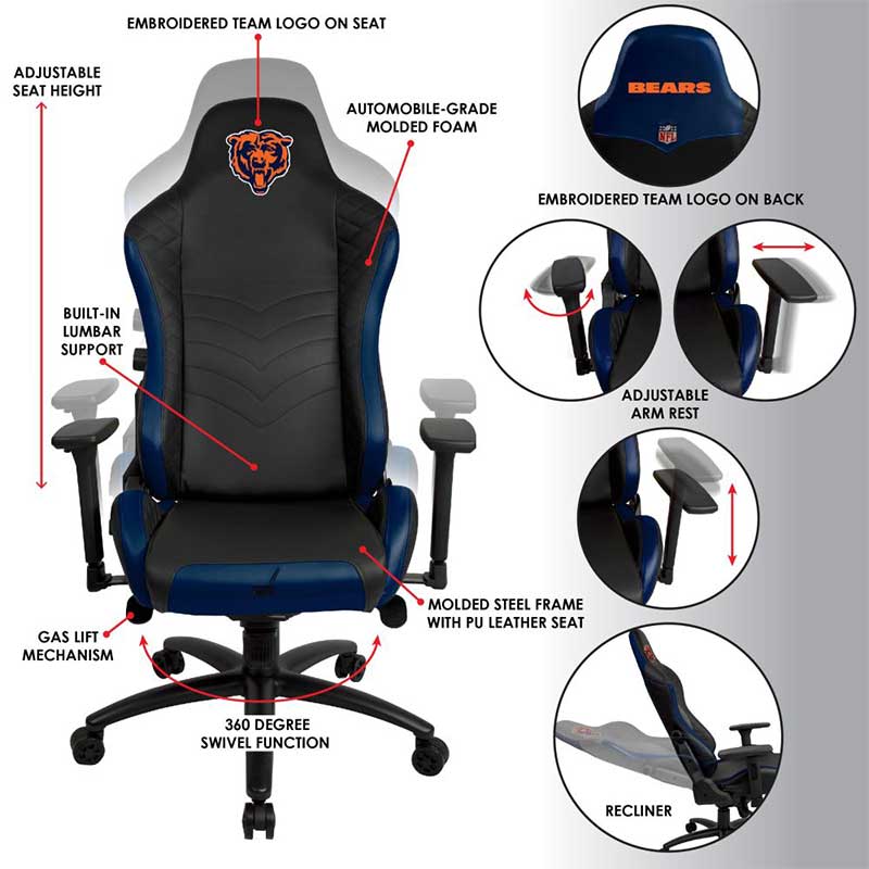 Up your game with the Chicago Bears React Pro Series Gaming Chair by Imperial. This chair is designed to optimize gameplay with its molded steel frame and high-quality PU leather seat with custom automobile-grade foam. Adjustable lumbar support, chair height and armrests make this chair completely versatile, keeping you playing at your best. This chair also features a 360 degree swivel function, rocking and reclining functions, and a gas lift mechanism to make it the ultimate gaming seat. Officially licensed by the NFL, this chair features team colors and embroidered logos on the chair seat and back.