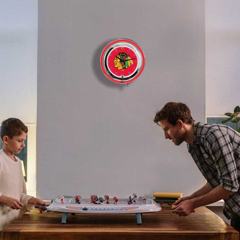 - Neon Lighting: Features brilliant red and black neon lights surrounding the clock face, highlighting the iconic Blackhawks logo with striking brightness.