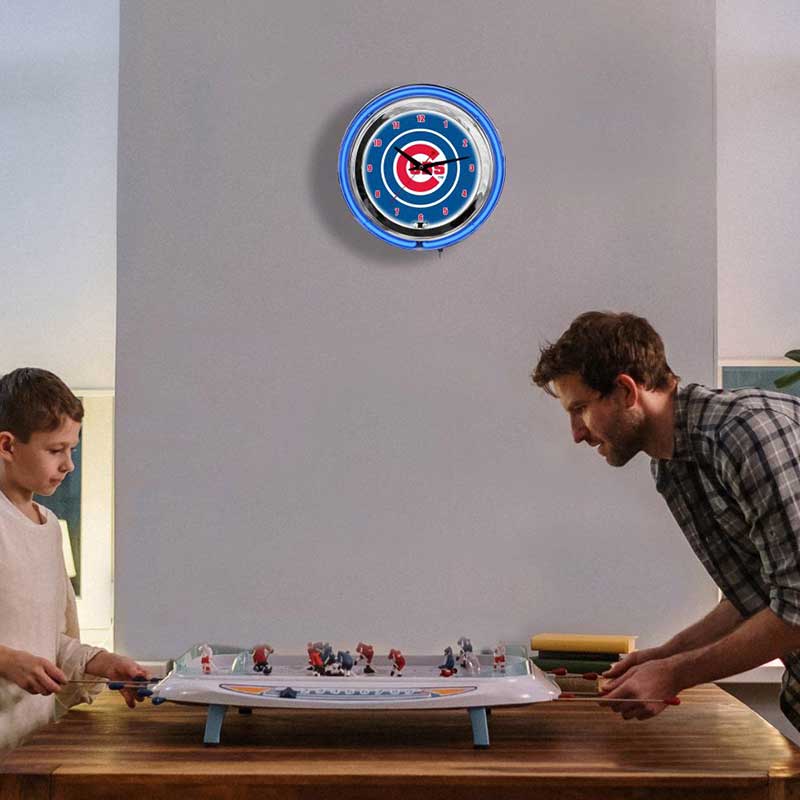 - Neon Lighting: Boasts vivid blue and red neon lights surrounding the clock face, illuminating the Cubs logo with eye-catching brilliance.