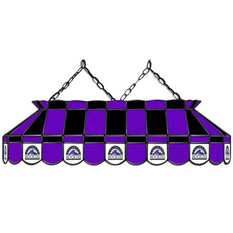 Light up your pool table and show off your team spirit with the Colorado Rockies 40 Inch Glass Lamp. Real stained glass that matches your favorite team’s colors. Each piece of glass is hand cut and soldered into its proper place with care and precision. Team logos are screen-printed directly onto the glass. There are 14 logos per lamp. Includes hanging chain, ceiling mounting plate, and installation instructions. Lamps are made to order. Made in the USA. Ships from Illinois. Allow 3-4 weeks for shipping. Product dimensions: 40″ L x 16″ W x 36″ H.