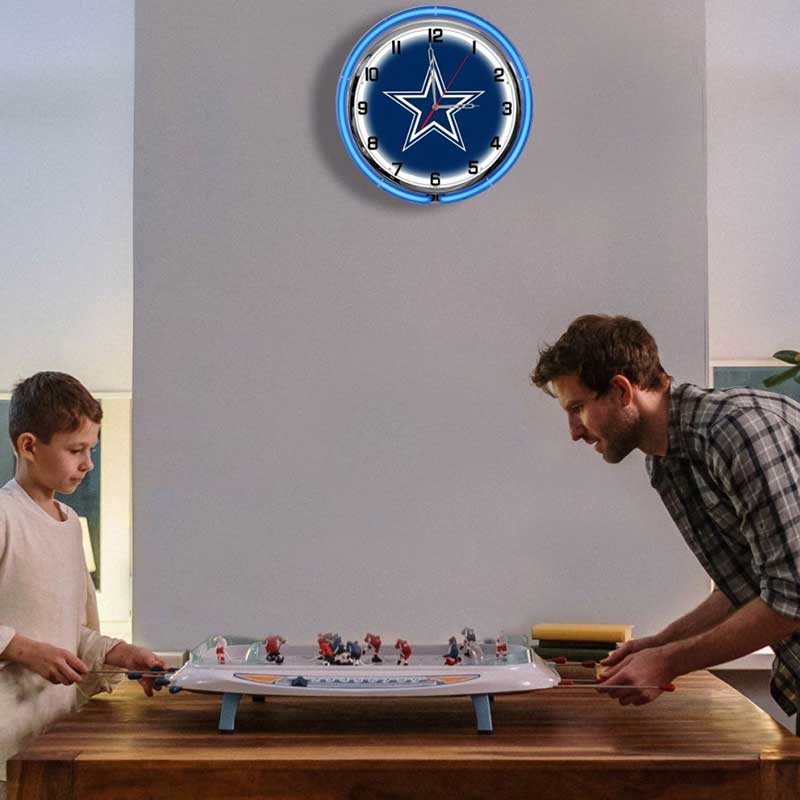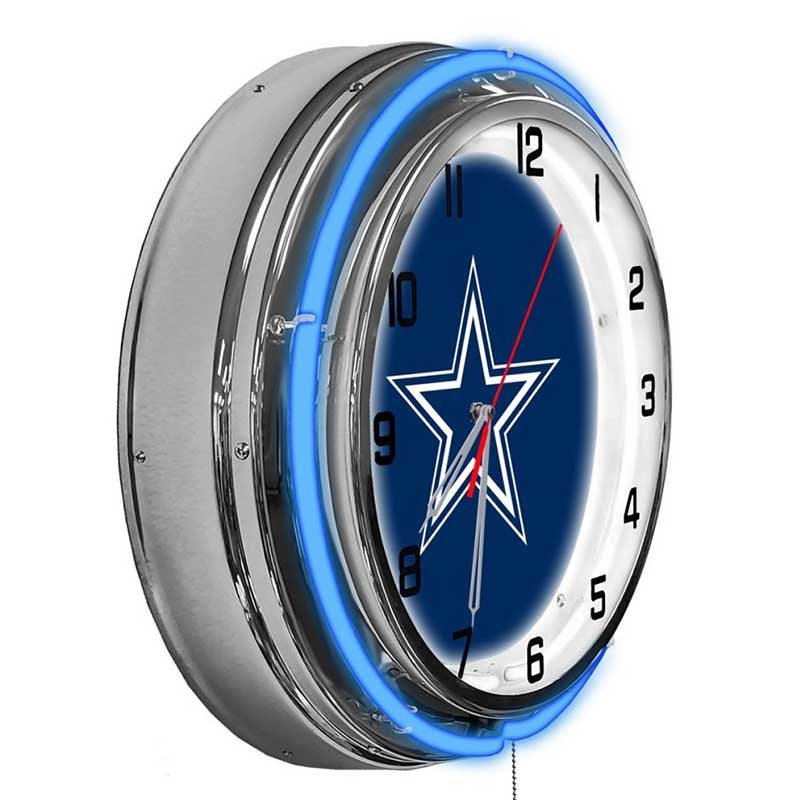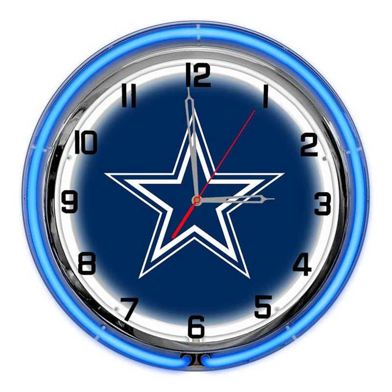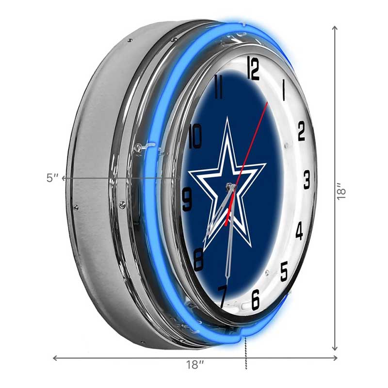 - Neon Lighting: Features vibrant blue and silver neon lights surrounding the clock face, highlighting the Cowboys logo with eye-catching illumination.