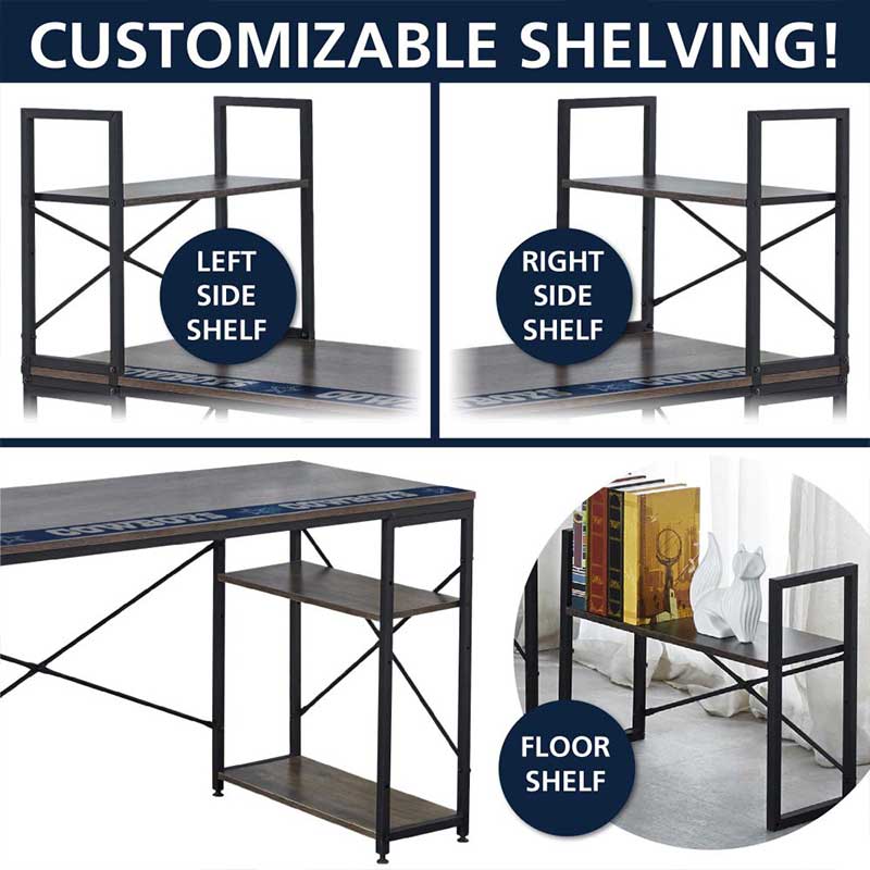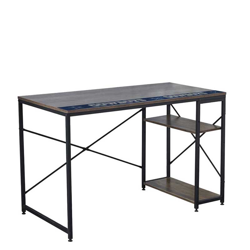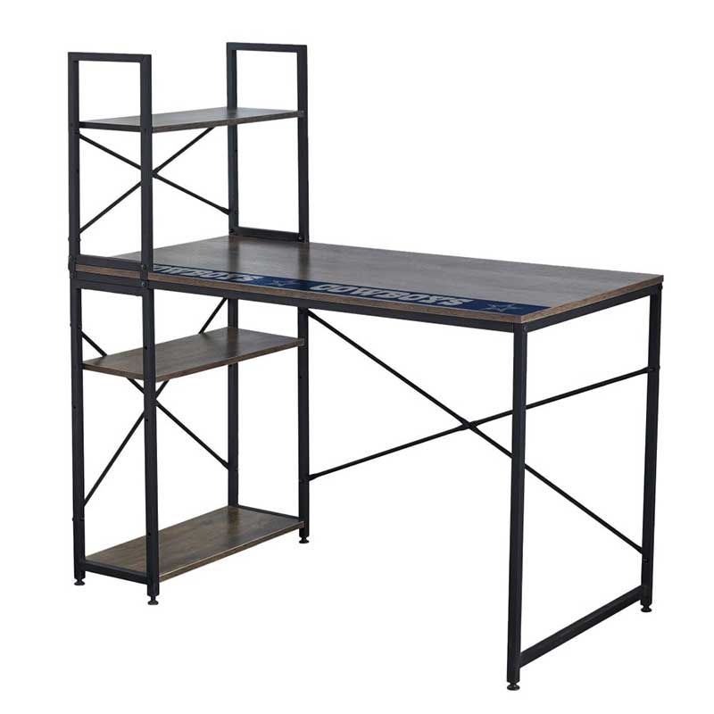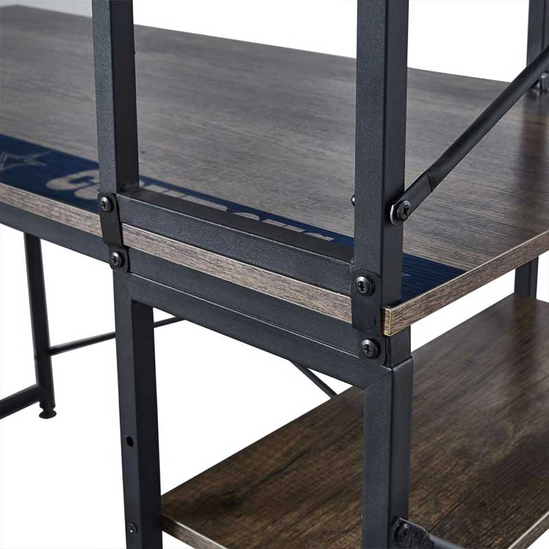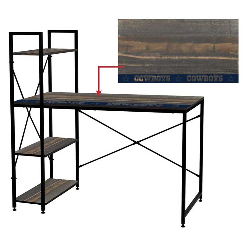 Customize your “Dallas Cowboys” workspace with this great space saving desk with exclusive shelf design system. This desk’s unique design lets you customize shelves below and above the desk surface and gives you plenty of space to stay organized. This industrial type look with a reclaimed desk top laminate blends well in all types of room decor. Perfect for writing and for use as a computer workstation