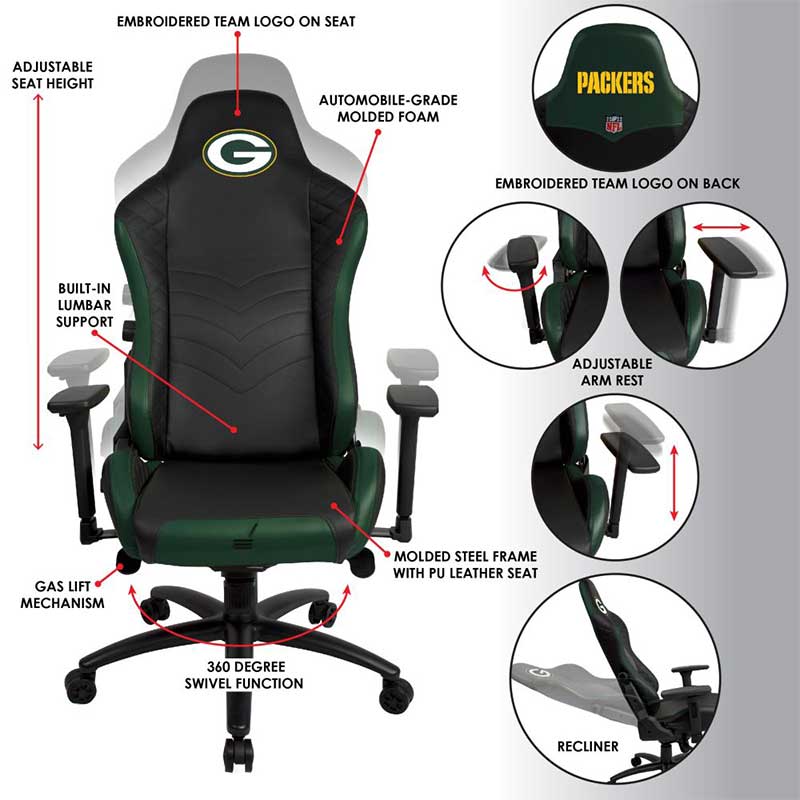Up your game with the Green Bay Packers React Pro Series Gaming Chair. This chair is designed to optimize gameplay with its molded steel frame and high-quality PU leather seat with custom automobile-grade foam. Adjustable lumbar support, chair height, and armrests make this chair completely versatile, keeping you playing at your best. This chair also features a 360-degree swivel function, rocking and reclining functions, and a gas lift mechanism to make it the ultimate gaming seat. Officially licensed by the NFL, this chair features team colors and embroidered logos on the chair seat and back.