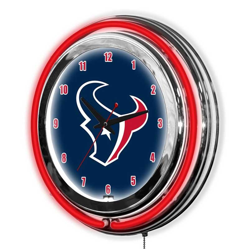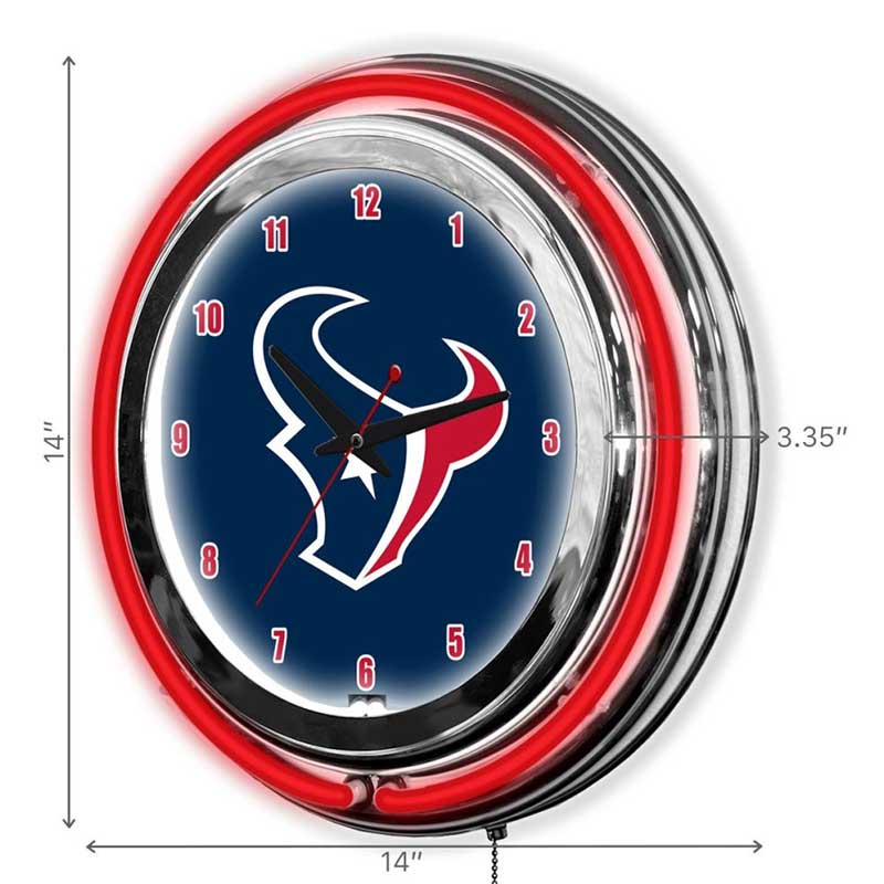 - Neon Lighting: Features vibrant, team-colored neon lights surrounding the clock face, illuminating the Texans logo and enhancing visual appeal.