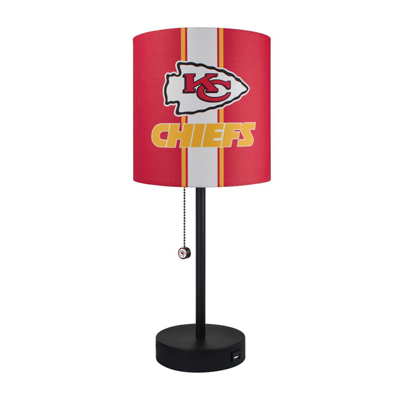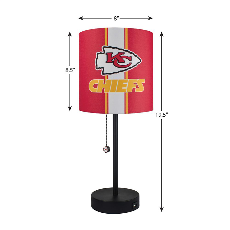 Brighten up your desk, side table, nightstand, you name it, this Kansas City Chiefs lamp with USB docking station is sure to fit in. Pull chain switch with Chiefs logo offers an easy on and off function. Charge up your phone or tablet close by to where you are reading or working with the built in charging station.