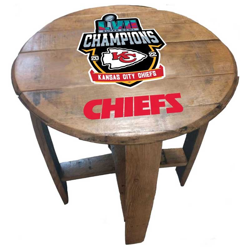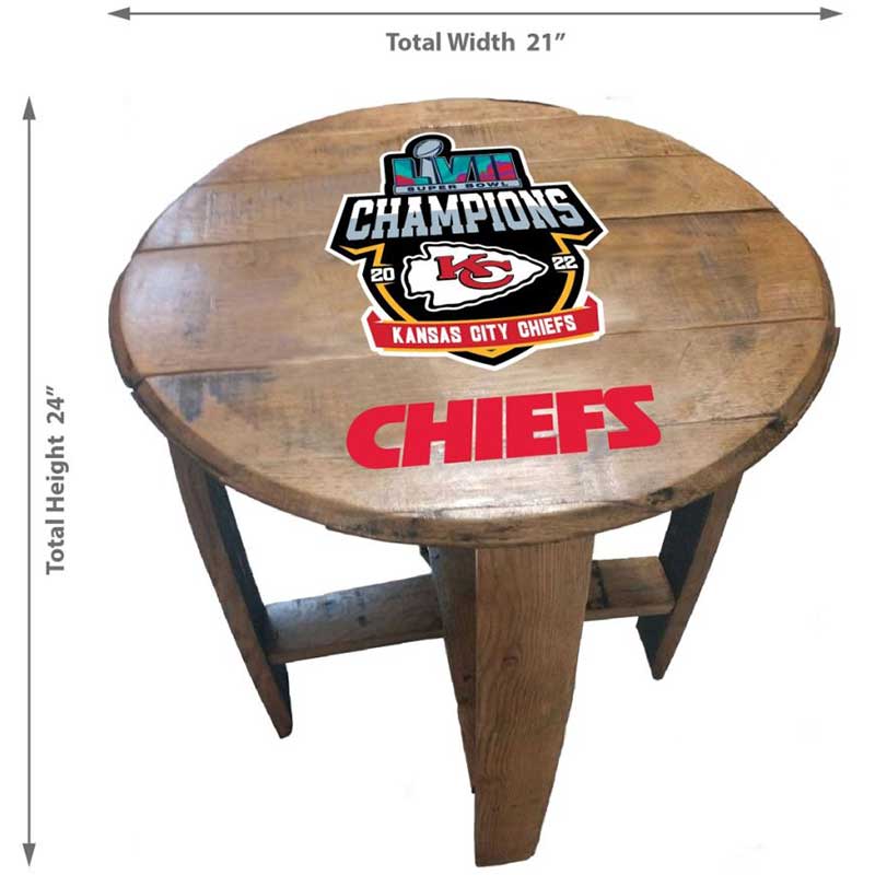 Celebrate your Kansas City Chiefs with this unique oak barrel end table. Featuring the Chiefs logo prominently displayed on the tabletop, this piece is perfect for showing your team loyalty. The table is crafted from genuine oak barrels, offering a sturdy and durable design that’s sure to last through many seasons. Its circular top provides ample space for your snacks and drinks, while the lower shelf can hold your favorite Chiefs memorabilia. This table is a must-have for any Chiefs fan’s home.