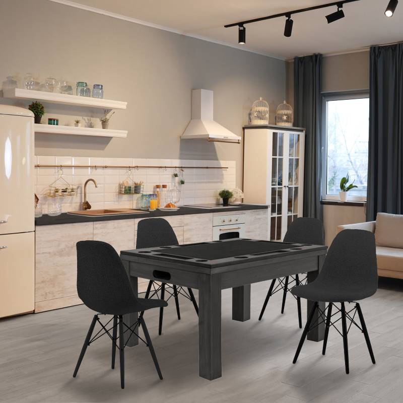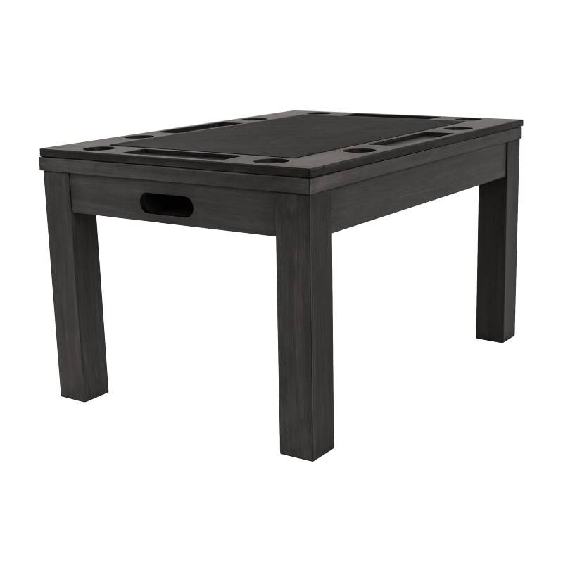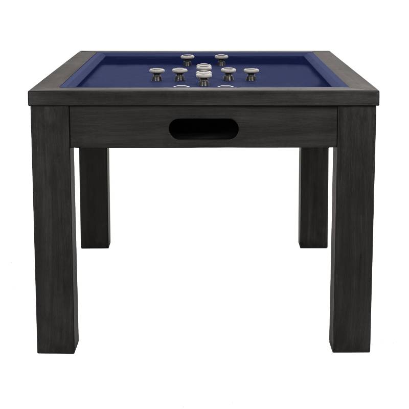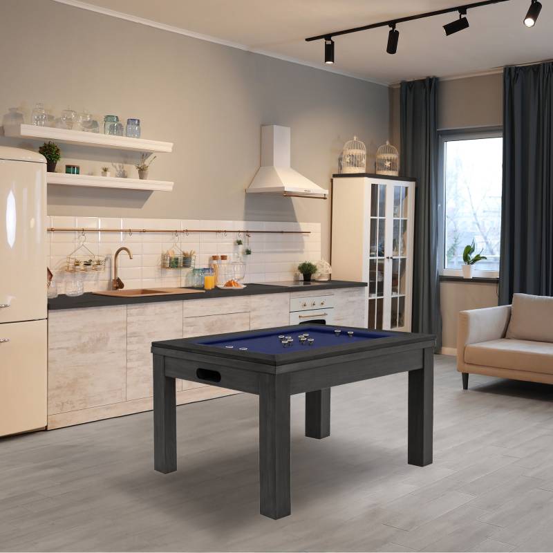 This Penelope bumper pool table is a convertible 3-in-1 table. It easily changes from a dining table to a card table with a flip of the conversion top. Removing the top reveals the bumper pool option.