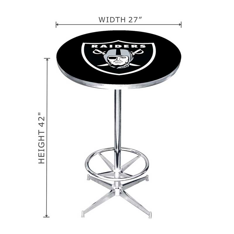 This Las Vegas Raiders Chrome Pub Table is perfect for you to enjoy the game for many years to come! Retro style telescopic steel base with leg levelers and foot ring. Team logo is digitally reproduced and captured within an extremely durable and impact resistant high pressure laminate. Chrome foil table edge banding. Dimensions: 27” diameter x 42” high; 35.35 pounds. Imported from China.