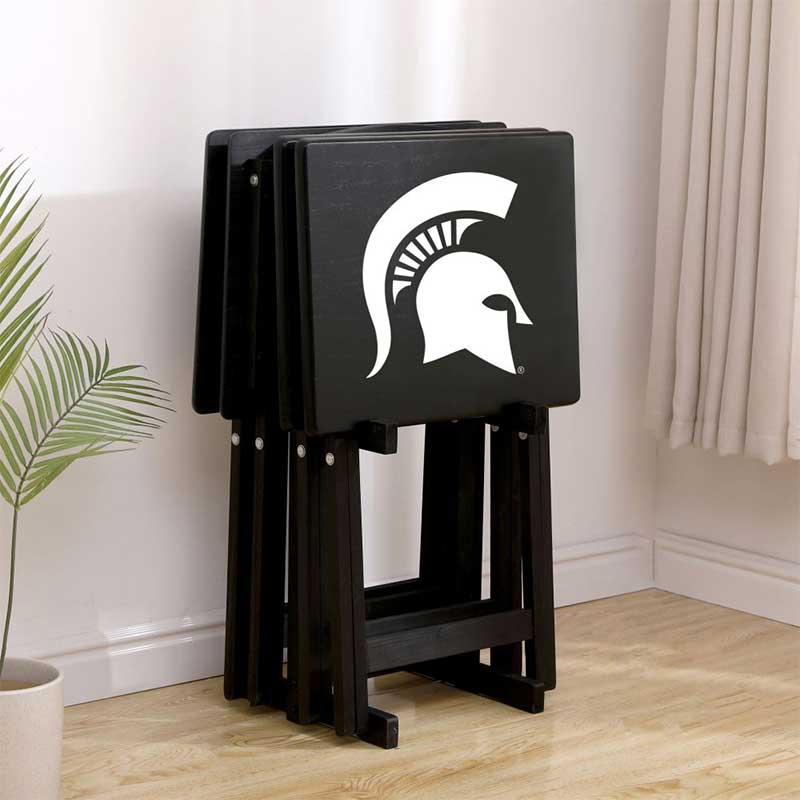 Show your team spirit with the Officially Licensed Collegiate TV Snack Tray Set. The heavy duty trays and storage rack are made from select hardwoods that are finished with a durable, easy to clean surface so you don’t have to worry about stains. Team logos are silkscreened on the top of each tray. When you are done snacking, put the trays back into the storage rack to keep things neat and clean. Each tray measures 26″L x 19″W x 14.5″H. Set of 4 snack trays and storage rack are made to order. Made in China.