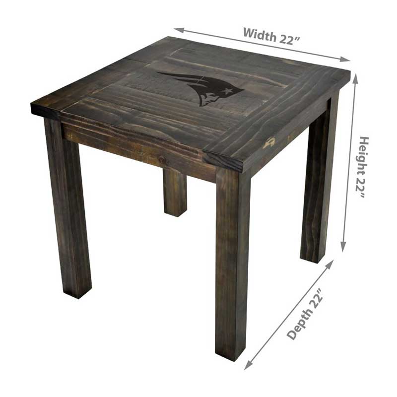 This New England Patriots Reclaimed Side Table from Imperial features your favorite team’s logo to bring team spirit to any living space. Made of solid pine wood. The table looks great holding drinks and snacks in your fan cave or as an accent piece in your living room. Pair this with a team coffee table to complete your room! Officially licensed by the NFL.