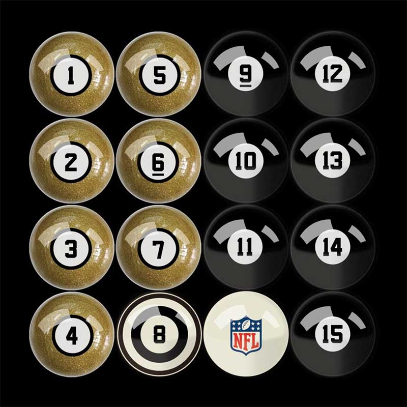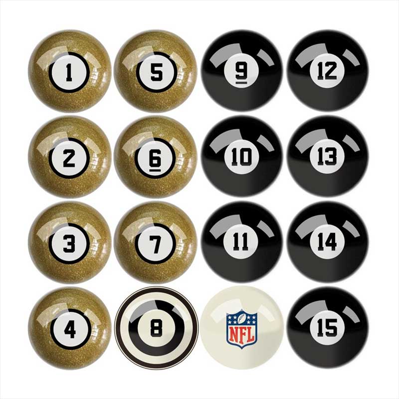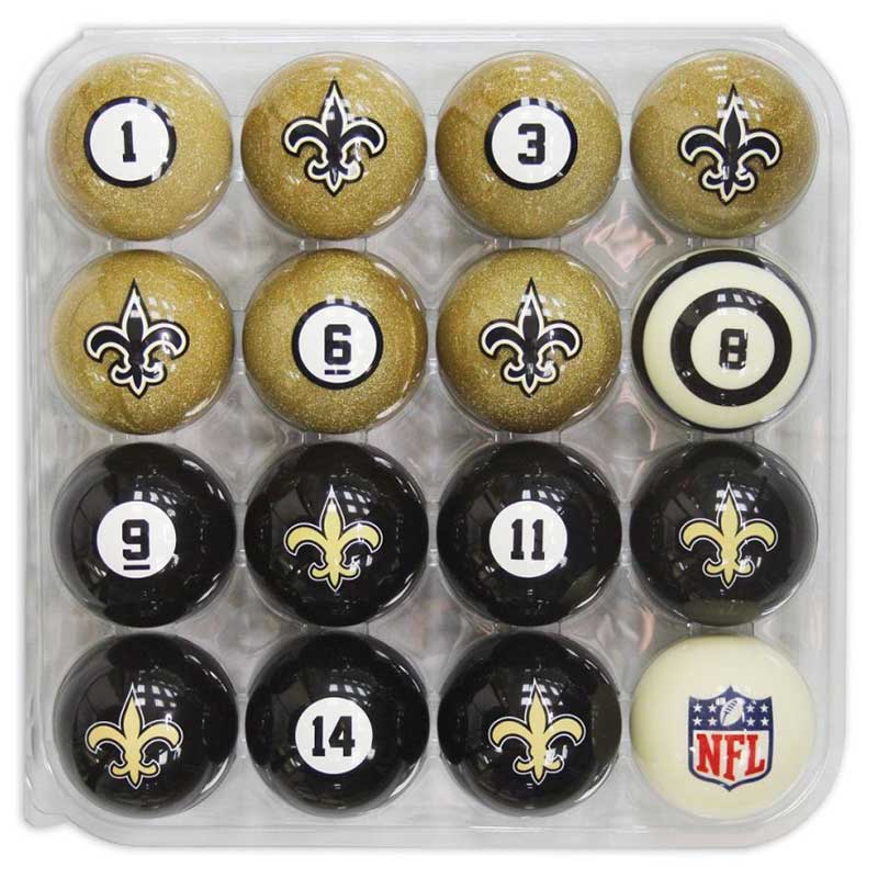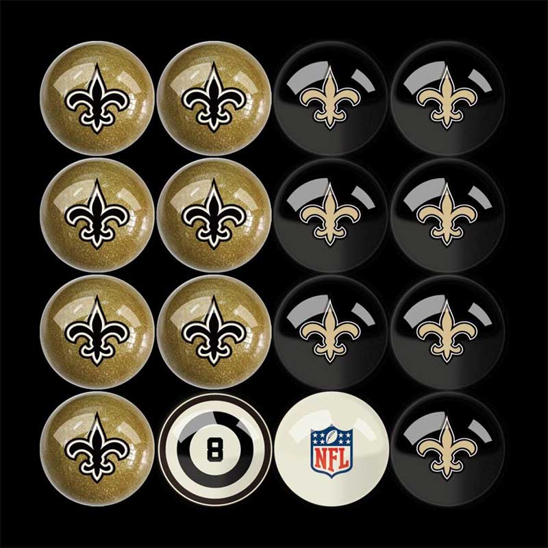 Take the New Orleans Saints to the pool table and enjoy a quick game of 8 ball or 9 ball. These balls have large team logos and numbers and really pop! Balls are regulation size and weight and made of a polyester resin that resists chipping and cracking. Time to get you a set!