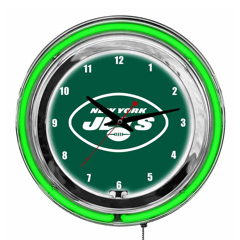 - Neon Lighting: Vibrant green and white neon lights surround the clock face, illuminating the Jets logo and enhancing visual appeal.