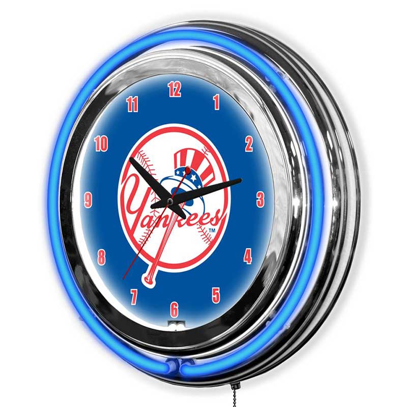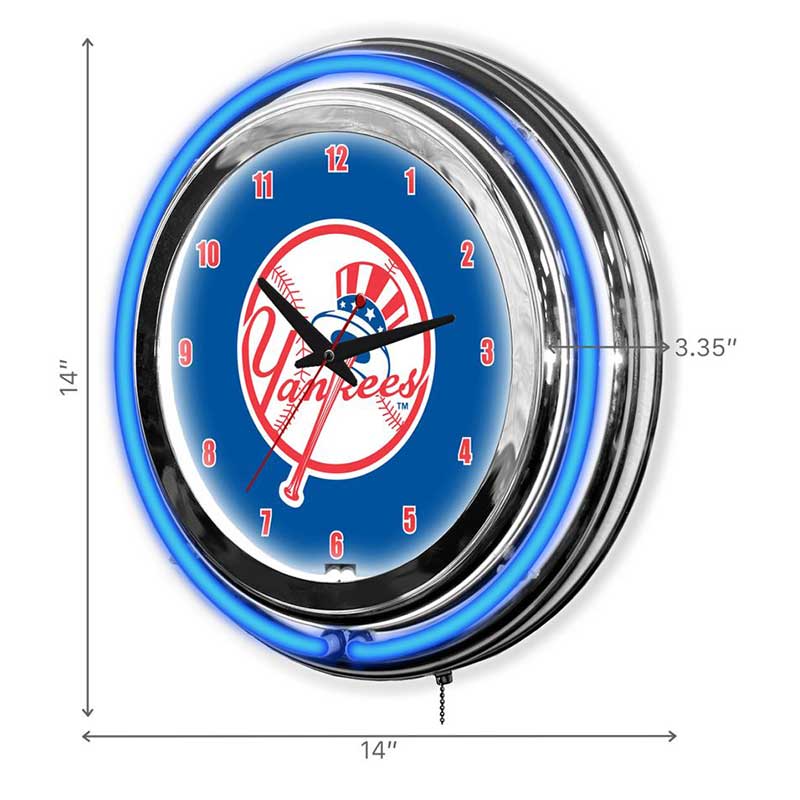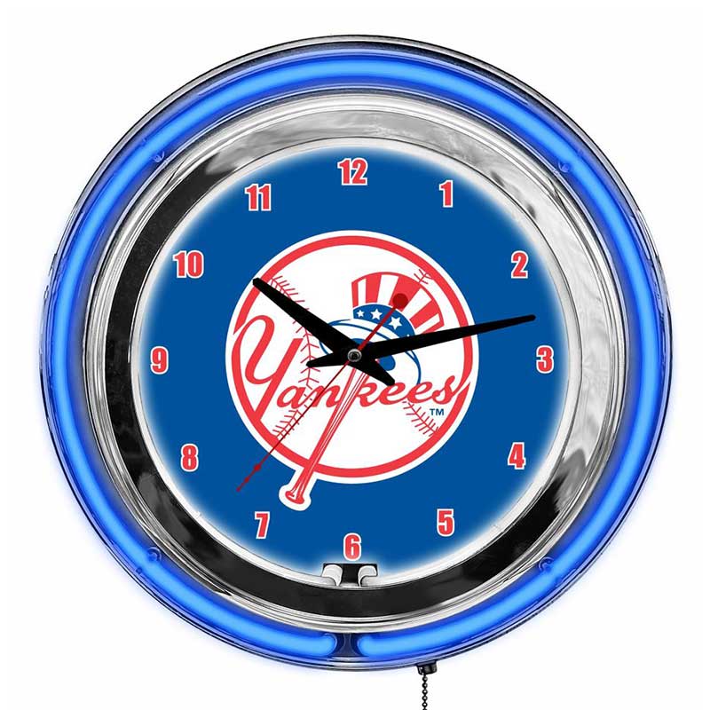 - Neon Lighting: Vibrant blue and white neon lights encircle the clock face, illuminating the Yankees logo and adding visual flair.