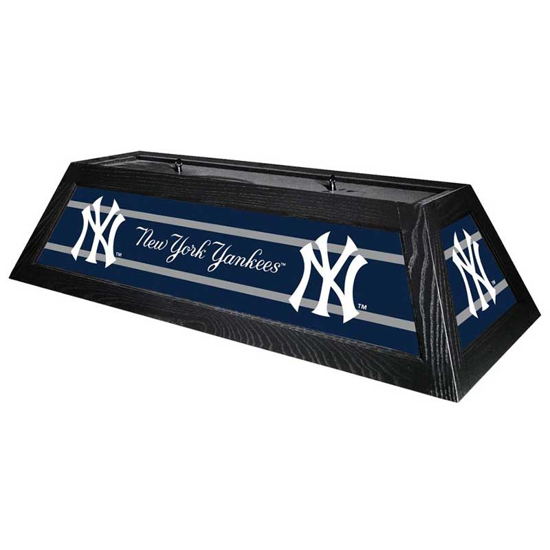 Your New York Yankees 42″ Billiard Lamp is built to last with a bright backlit design digitally printed on shatter resistant acrylic panels. The solid black hardwood frame, will both compliment your billiard table as well as illuminate it with up to 400w of light for the playing surface. Everything is included to hardwire this beauty above your favorite pool table.