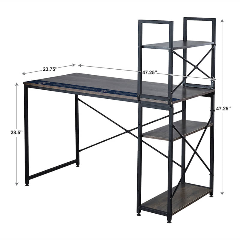 Customize your “New York Yankees” workspace with this great space saving desk with exclusive shelf design system. This desk’s unique design lets you customize shelves below and above the desk surface and gives you plenty of space to stay organized. This industrial type look with a reclaimed desk top laminate blends well in all types of room décor. Perfect for writing and for use as a computer workstation.