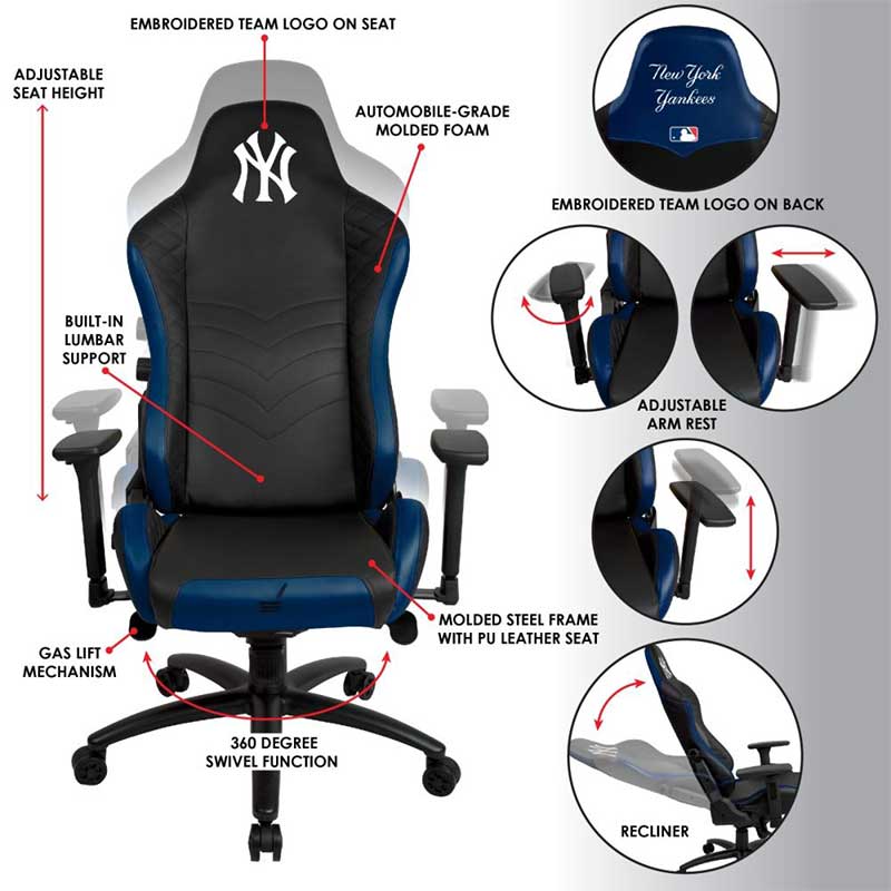 Up your game with the New York Yankees Pro Series Gaming Chair by Imperial. This chair is designed to optimize gameplay with its molded steel frame and high-quality PU leather seat with custom automobile-grade foam. Adjustable lumbar support, chair height and armrests make this chair completely versatile, keeping you playing at your best. This chair also features a 360-degree swivel function, rocking and reclining functions, and a gas lift mechanism to make it the ultimate gaming seat. Officially licensed by the MLB, this chair features team colors and embroidered logos on the chair seat and back.