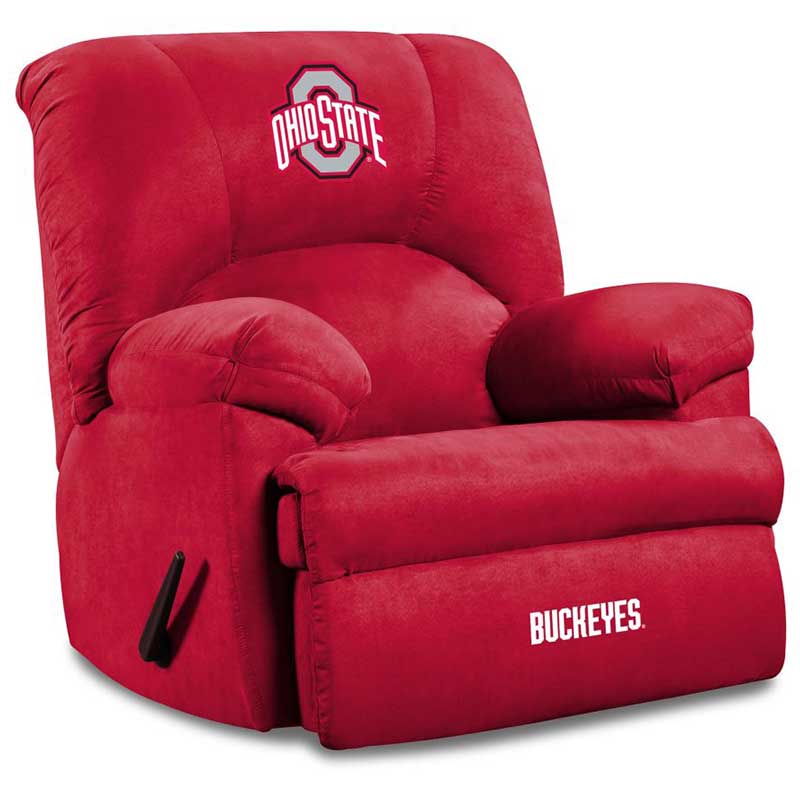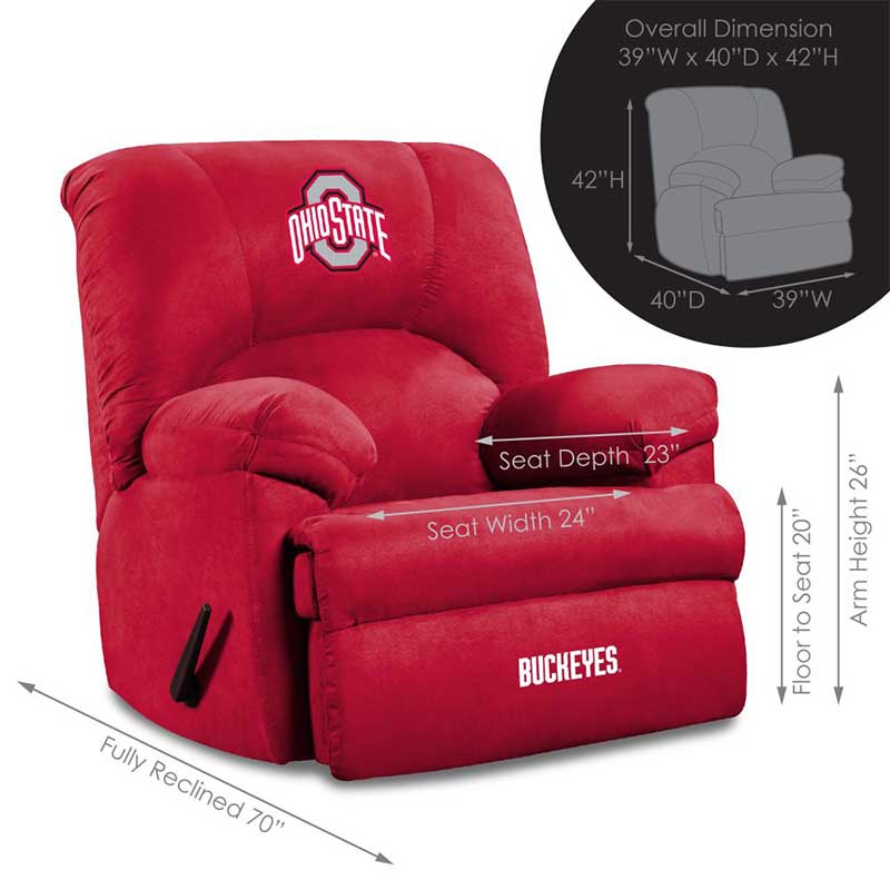 Watch the Buckeye game in complete comfort with the Ohio State GM Recliner. Bring home-field advantage to any room of the house with durable, vibrant microfiber fabric decked out with an embroidered logo on the headrest and ottoman. Enjoy this rocker recliner, fit to for the fan up to 6 foot tall. A kiln-dried hardwood and cross-banded plywood frame make this chair as sturdy as it is comfortable. Product is officially licensed by the University and is made in the USA.