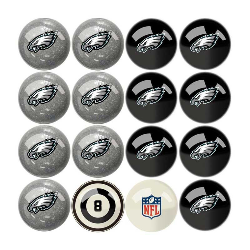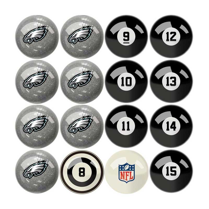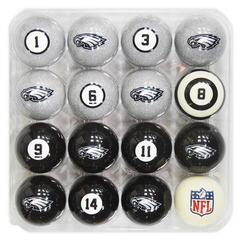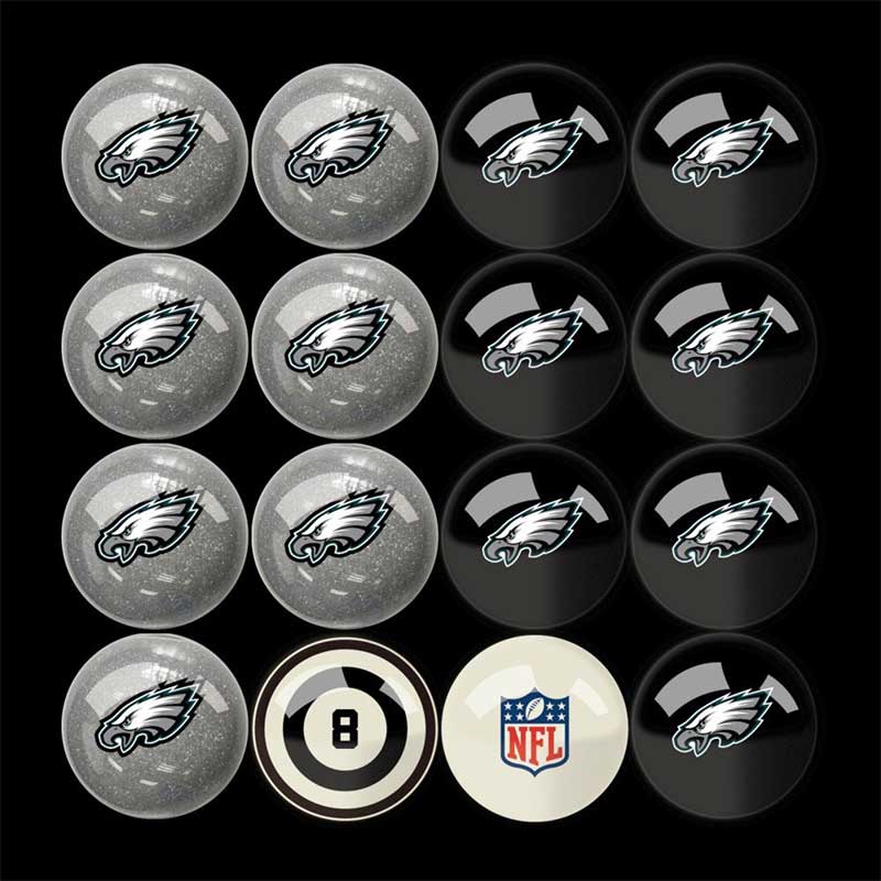 Take your Philadelphia Eagles Billiard Balls to the pool table and enjoy a quick game of 8-ball or 9-ball. These balls have large team logos and numbers and really pop! Balls are regulation size and weight and made of a polyester resin that resists chipping and cracking. Time to get you a set!