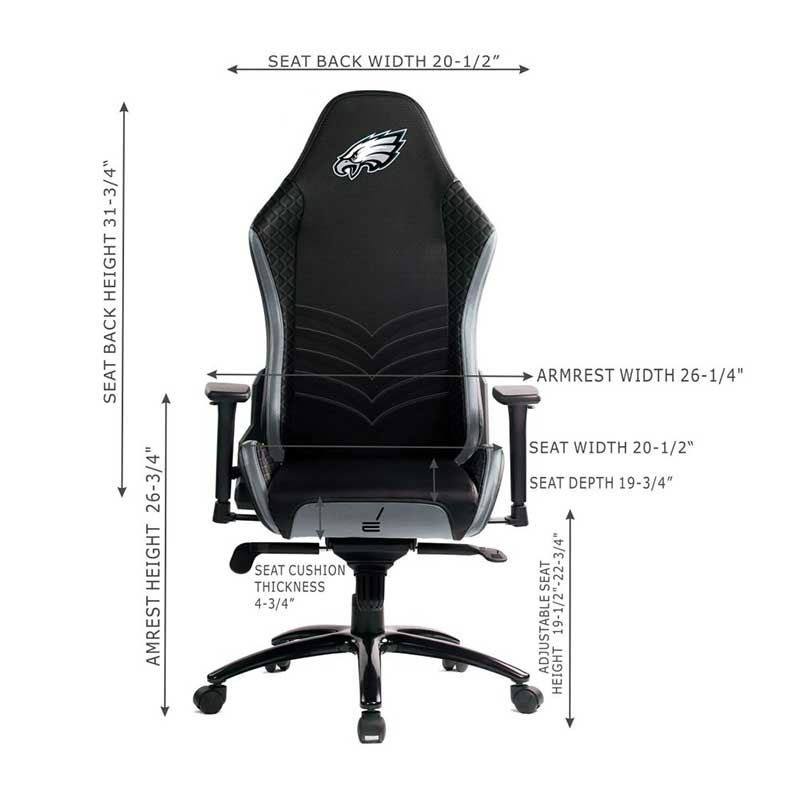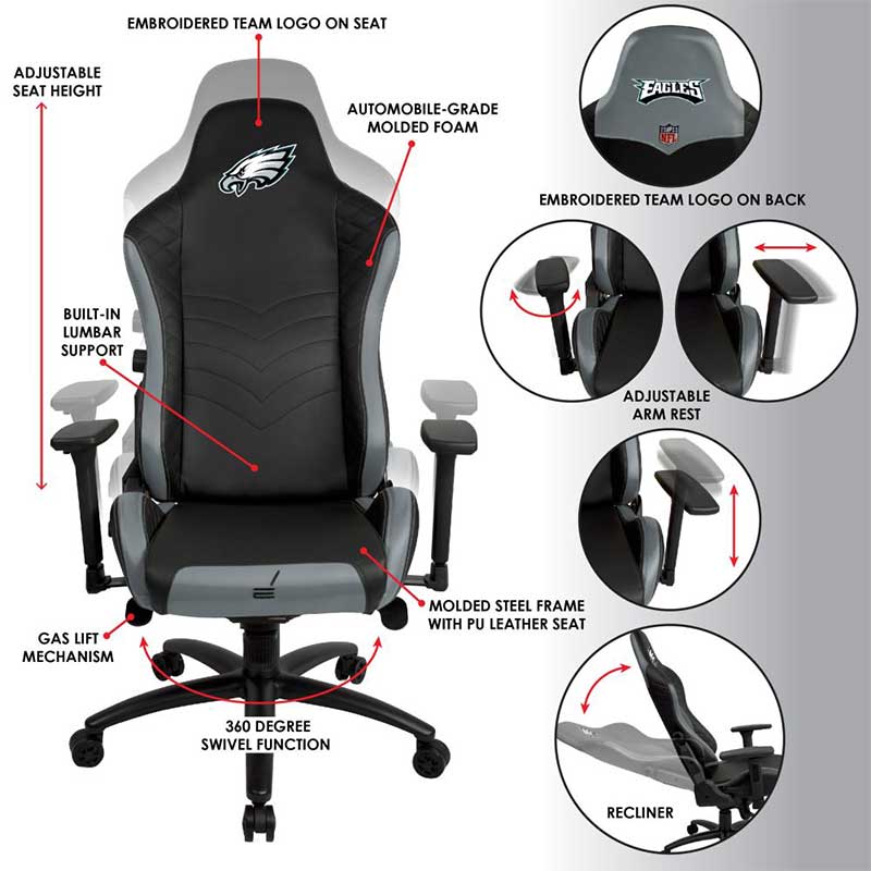 Up your game with the Philadelphia Eagles React Pro Series Gaming Chair by Imperial. This chair is designed to optimize gameplay with its molded steel frame and high-quality PU leather seat with custom automobile-grade foam. Adjustable lumbar support, chair height and armrests make this chair completely versatile, keeping you playing at your best. This chair also features a 360 degree swivel function, rocking and reclining functions, and a gas lift mechanism to make it the ultimate gaming seat. Officially licensed by the NFL, this chair features team colors and embroidered logos on the chair seat and back.
