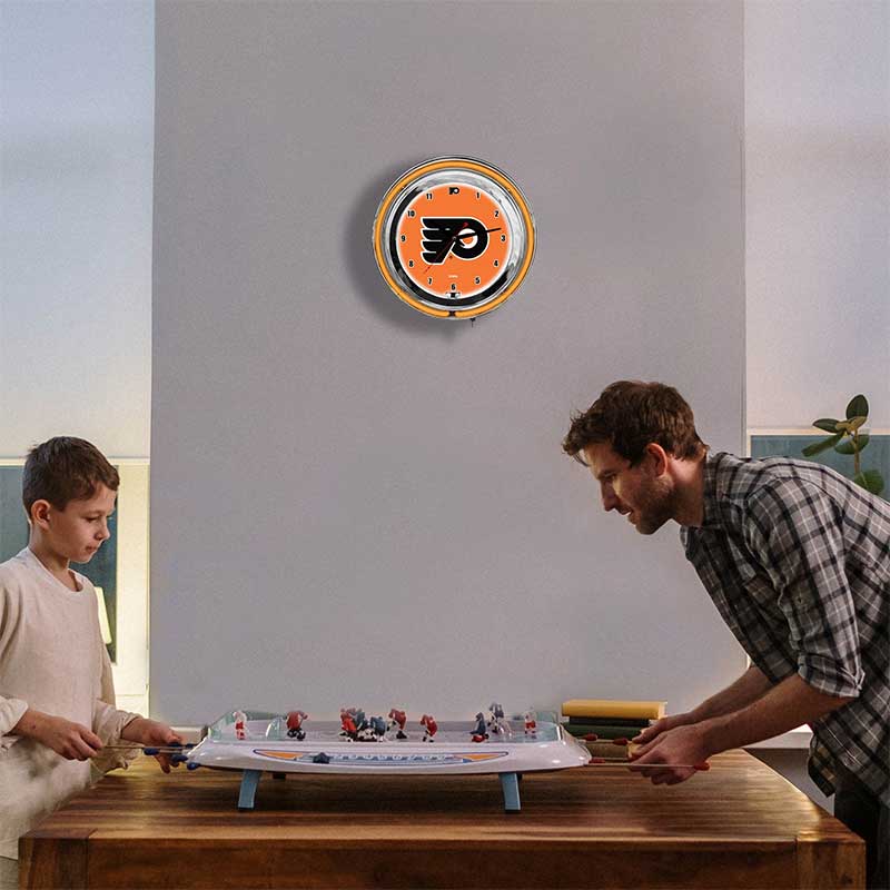 - Neon Lighting: Features bold orange and white neon lights surrounding the clock face, highlighting the iconic Flyers logo with vibrant illumination.