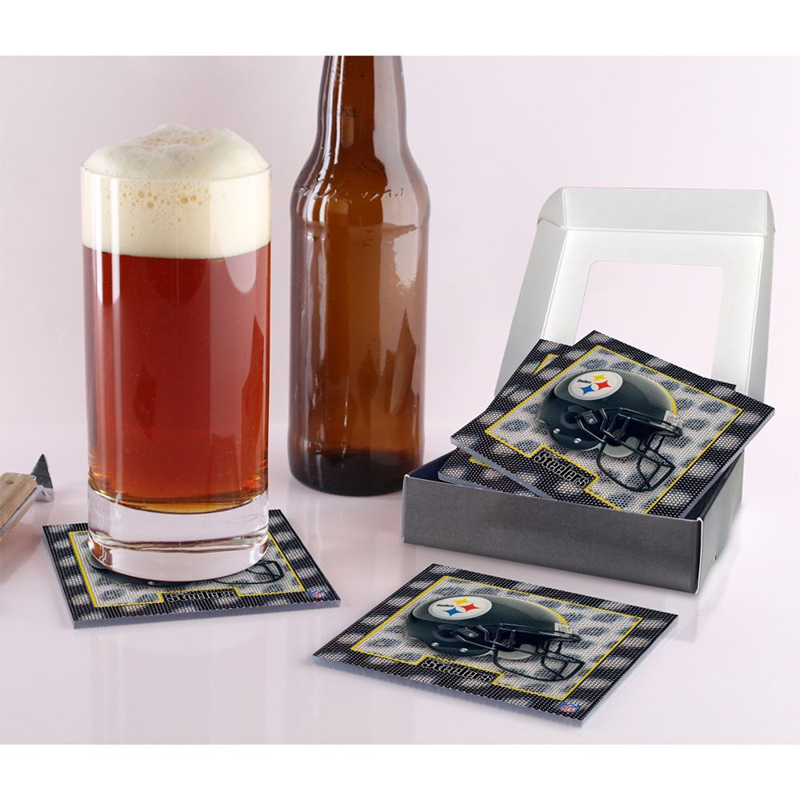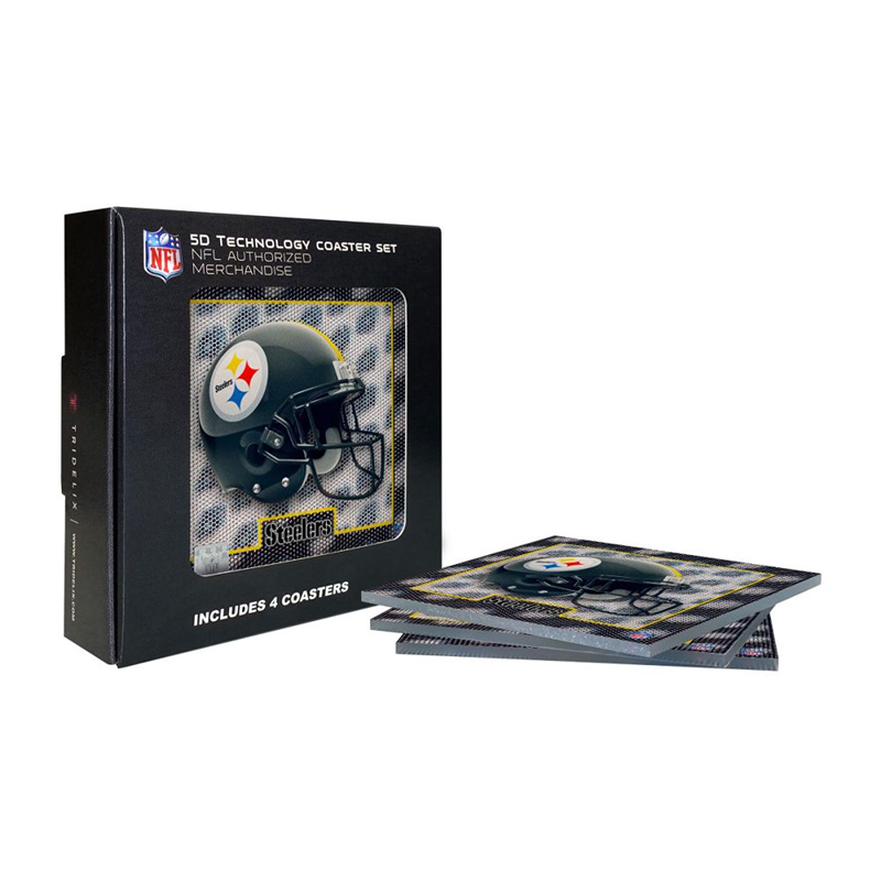 Our NFL Pittsburgh Steelers 5D floating helmet coaster sets are exactly what you need to proudly display your team’s colors on your nightstand, living room coffee table, home office, man cave, or anywhere that needs some spicing up! These Pittsburgh Steelers coasters come 4 to a set and are sure to be the talk of your friends when you gather to watch the game this year! Treat yourself to something special this season! Match this up with the NFL Cel Phone Charger, Desk Topper, and Framed Wall Art to complete the assortment!