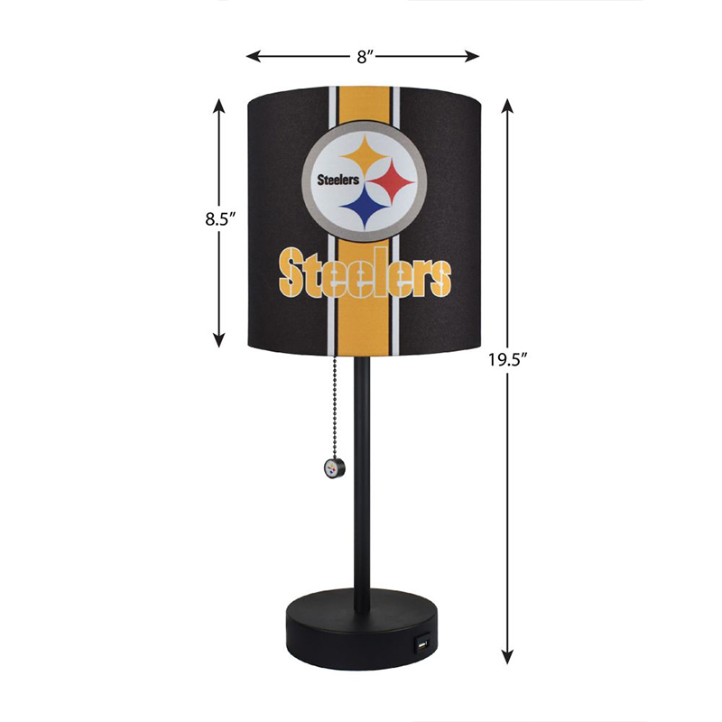 Brighten up your desk, side table, nightstand, you name it, this Pittsburgh Steelers lamp with USB docking station is sure to fit in. Pull chain switch with Steelers logo offers an easy on and off function. Charge up your phone or tablet close by to where you are reading or working with the built in charging station.
