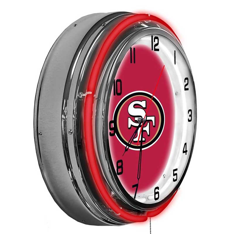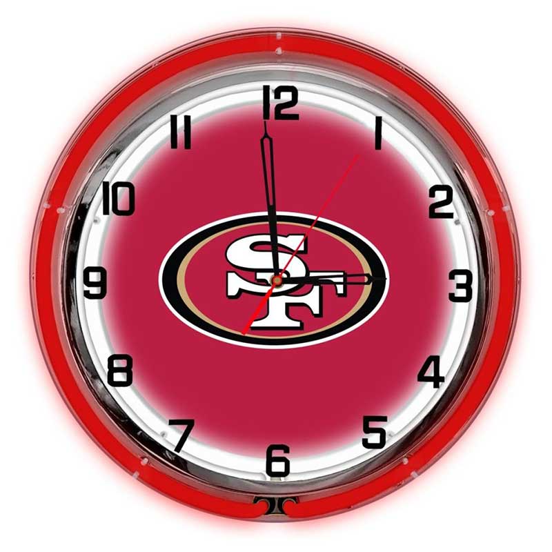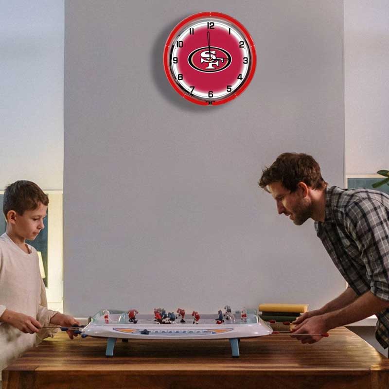 - Neon Lighting: Features vibrant red and gold neon lights surrounding the clock face, highlighting the 49ERS logo with eye-catching illumination.