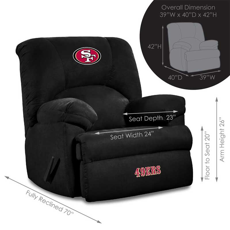 Watch the Big Game in complete comfort with the San Francisco 49ers GM Recliner. Bring home-field advantage to any room of the house with durable, vibrant microfiber fabric decked out with an embroidered logo on the headrest and ottoman. Enjoy this rocker recliner, fit to for the fan up to 6 foot tall. A kiln-dried hardwood and cross-banded plywood frame make this chair as sturdy as it is comfortable. Product is officially licensed by the NFL and is made in the USA.