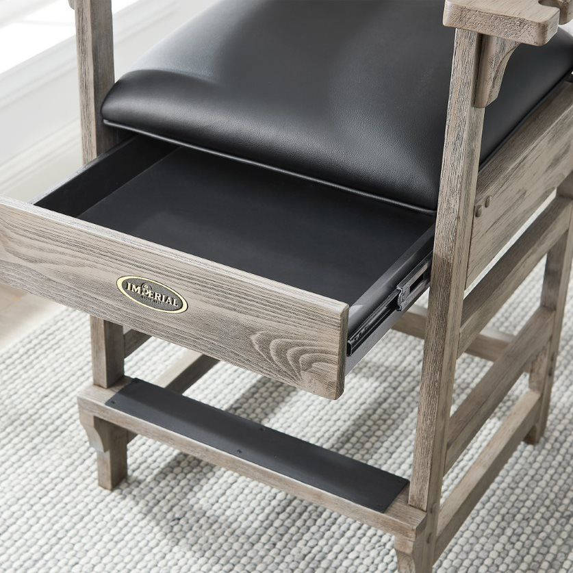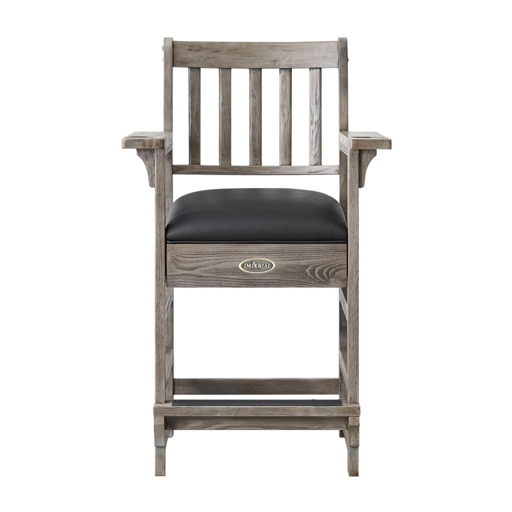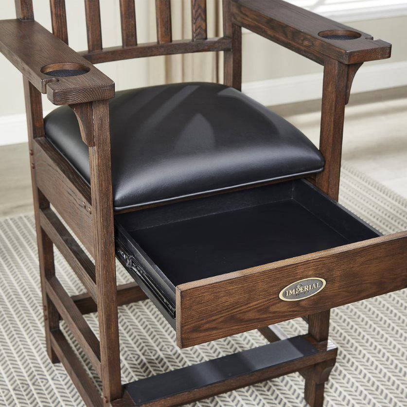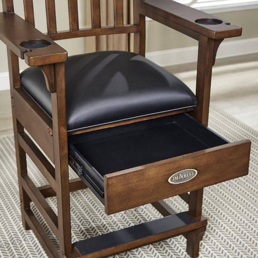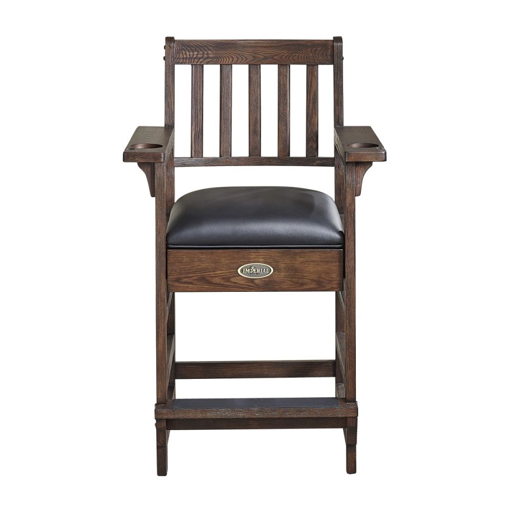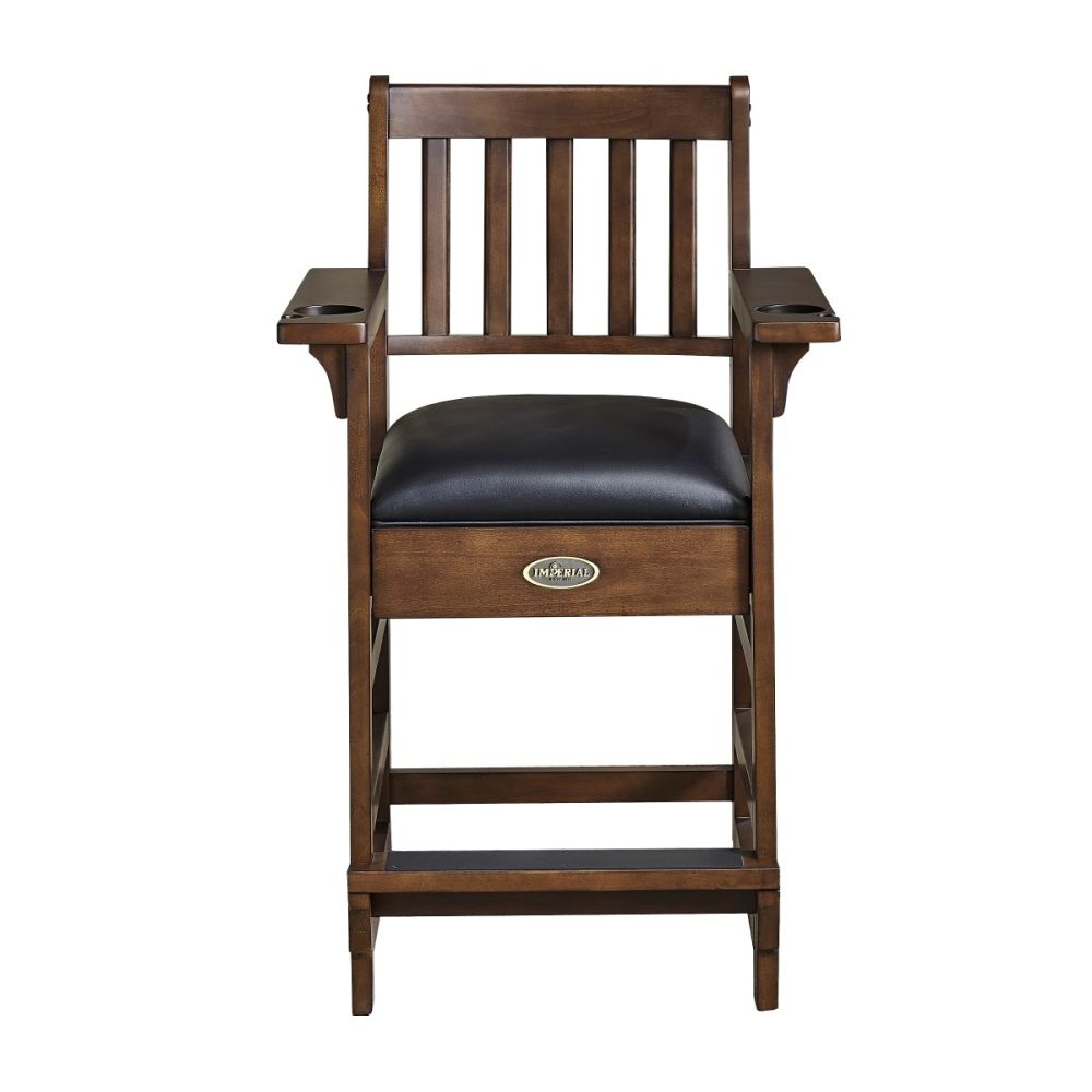 The Imperial Premium Spectator Chair is a must-have addition for any room with a pool table. Made of solid wood, this chair features a beautiful rustic or smooth finish (depending on choice of finish) that enhances the natural wood grains and provides protection against scratching and marring. With a variety of color options, the Premium Spectator chair can be paired with any Imperial pool table to complete your game room. The dense foam cushion, slatted backrest, and convenient footrest provide comfort and support while you break between turns or watch a match. The seat cushion is finished in durable Polyurethane and the arms feature cup holders and cue rest holes. Seat height 27-inches from the floor, seat size is 19 x 20 inches, and the chair stands at a total of 45.75-inches tall.
