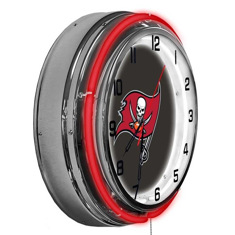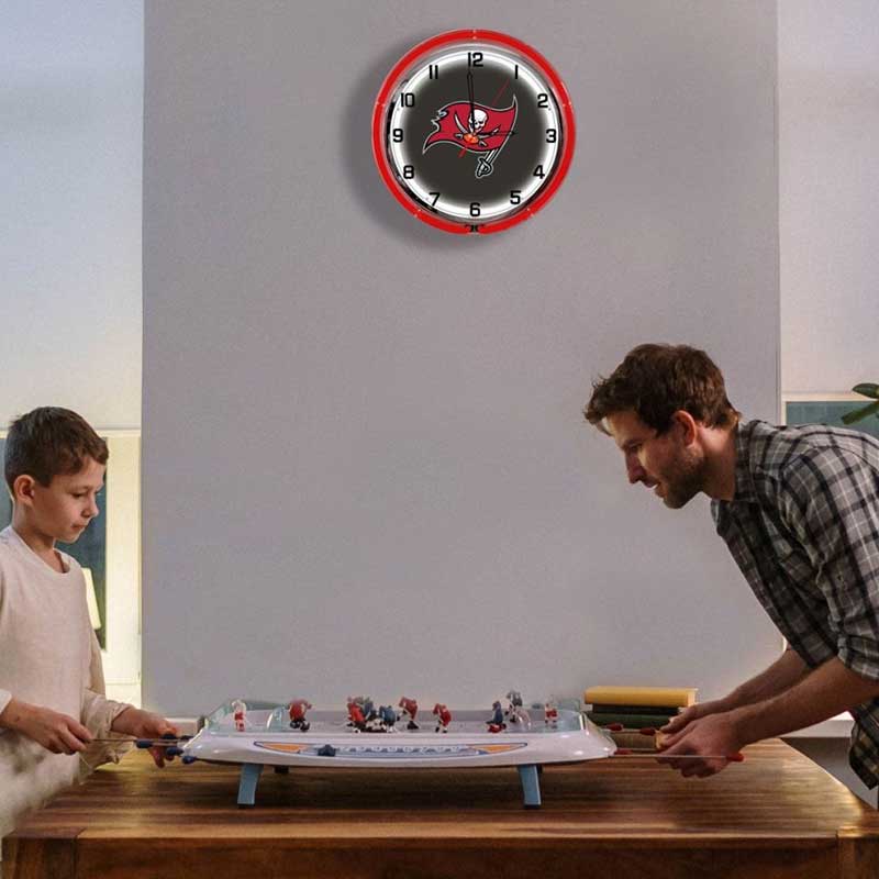 - Neon Lighting: Features vibrant red and pewter neon lights surrounding the clock face, showcasing the Buccaneers logo with captivating illumination.