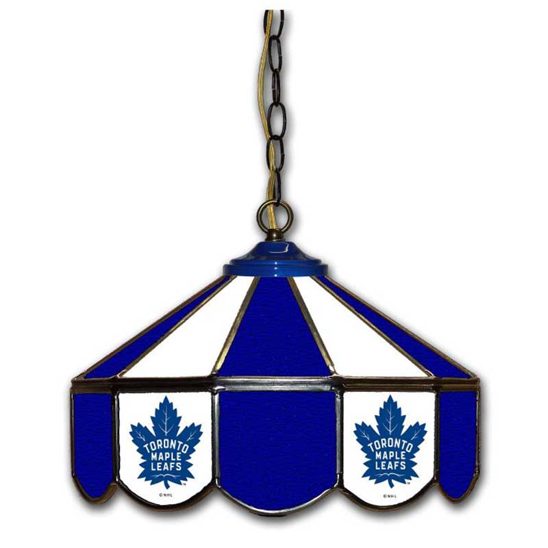 Light up your game room or fan cave while showing off your team spirit with this officially licensed Toronto Maple Leafs 14″ Glass Pub Lamp. Real hand-cut stained glass with team colors and logos looks great in any room. Fully wired with 1 UL. Approved high-quality porcelain light socket and a 12-foot cord with inline switch and polarized plug. 9-feet of heavy duty antique brass chain adds a touch of luxury to the lamp. Chain and ceiling mounting hardware included, bulb not included. This product is officially licensed by the NHL and is made in the USA.