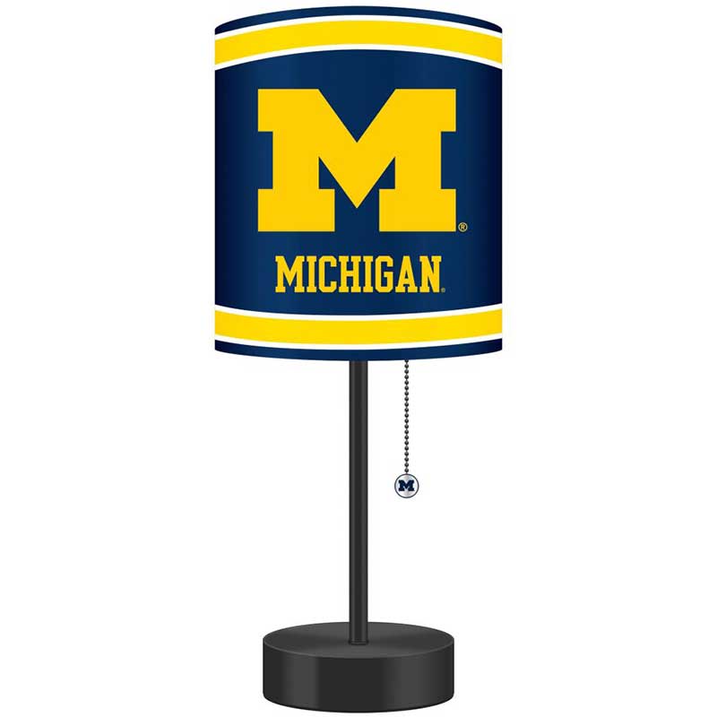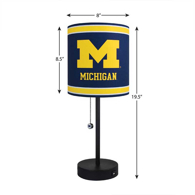 Brighten up your desk, side table, nightstand, you name it, this University of Michigan lamp with USB docking station is sure to fit in. Pull chain switch with Michigan logo offers an easy on and off function. Charge up your phone or tablet close by to where you are reading or working with the built in charging station.