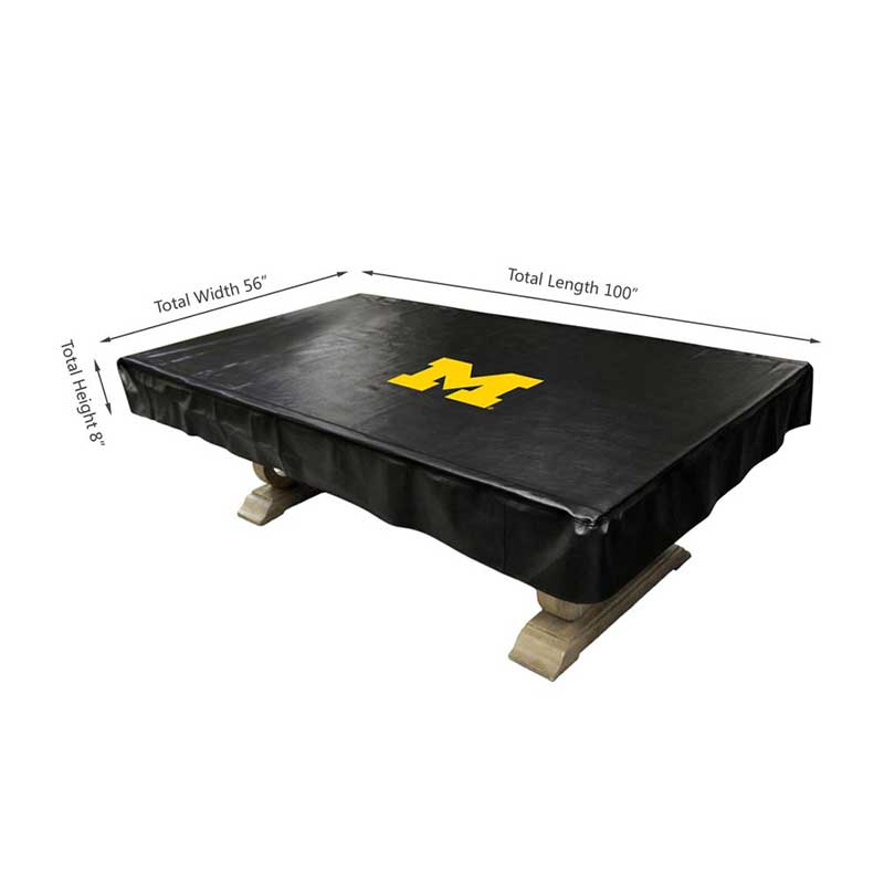 Show your team spirit even when you’re not playing. The Officially Licensed Collegiate Billiard Table Cover is a great way to show your loyalty to your team while protecting your table from dirt. This high quality Naugahyde cover covers fits most standard 8-foot tables. Measures 56-inches wide x 100-inches long. Team logos are silk screened in the center using vibrant inks to make sure your team’s logo looks great for many years.