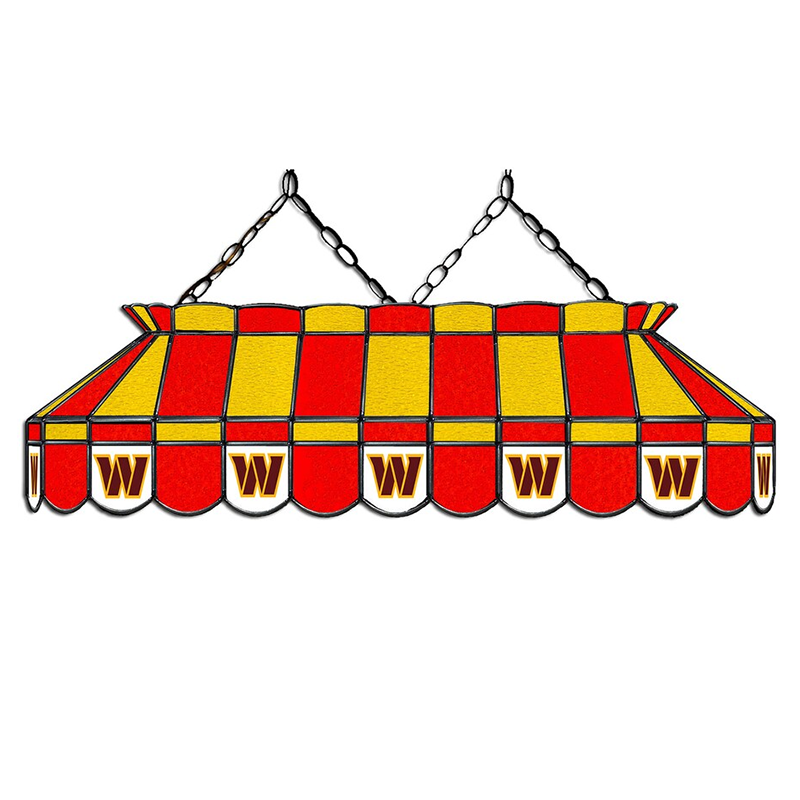 Light up your pool table and show off your team spirit with the Washington Commanders 40 Inch Glass Lamp. Real stained glass that matches your favorite teams colors. Each piece of glass is hand cut and soldered into its proper place with care and precision. Team logos are screen-printed directly onto the glass. There are 14 logos per lamp. Includes hanging chain, ceiling mounting plate, and installation instructions. Lamps are made to order. Made in the USA. Ships from Illinois. Allow 3-4 weeks for shipping. Product dimensions: 40″L x16″W x86″H.