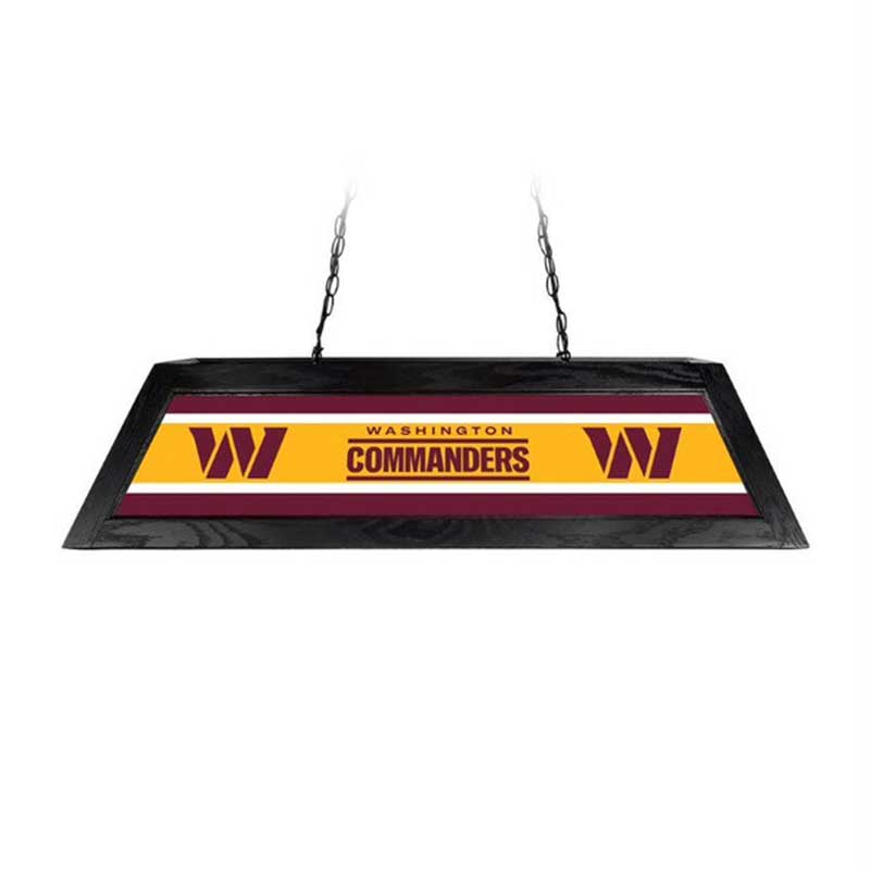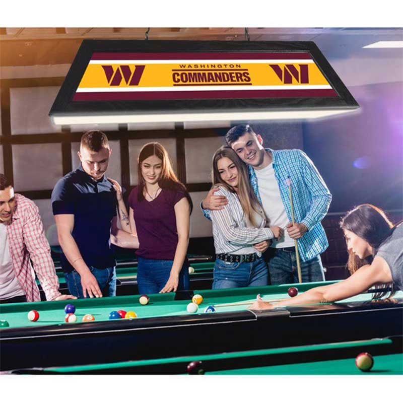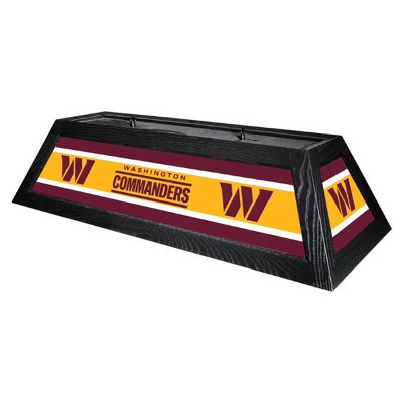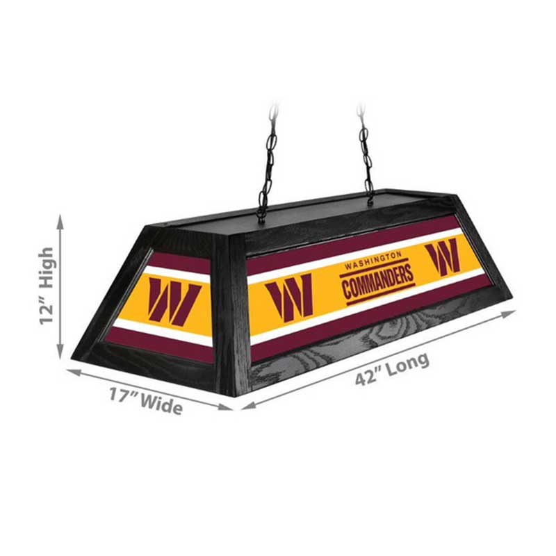 Your Washington Commanders 42″ Billiard Lamp is built to last with a bright backlit design digitally printed on shatter resistant acrylic panels. The solid black hardwood frame, will both compliment your billiard table as well as illuminate it with up to 400w of light for the playing surface. Everything is included to hardwire this beauty above your favorite pool table.