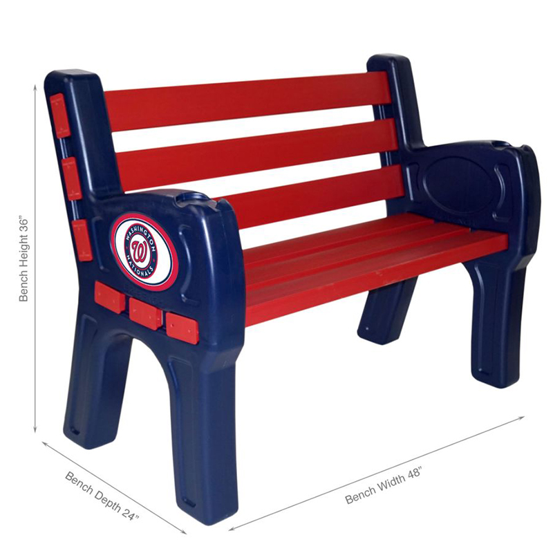 Support your favorite MLB team on your patio or in your yard with the MLB Officially Licensed Park Bench. Backs and seat are constructed of pine and covered with plastic sleeves for extra durability. The bench uses the primary and secondary colors of your favorite team. Made in the USA and ships from Iowa. 600 pound weight limit. Assembled dimensions: 48”L x 24”W x 36”H. 3 days lead time to ship.