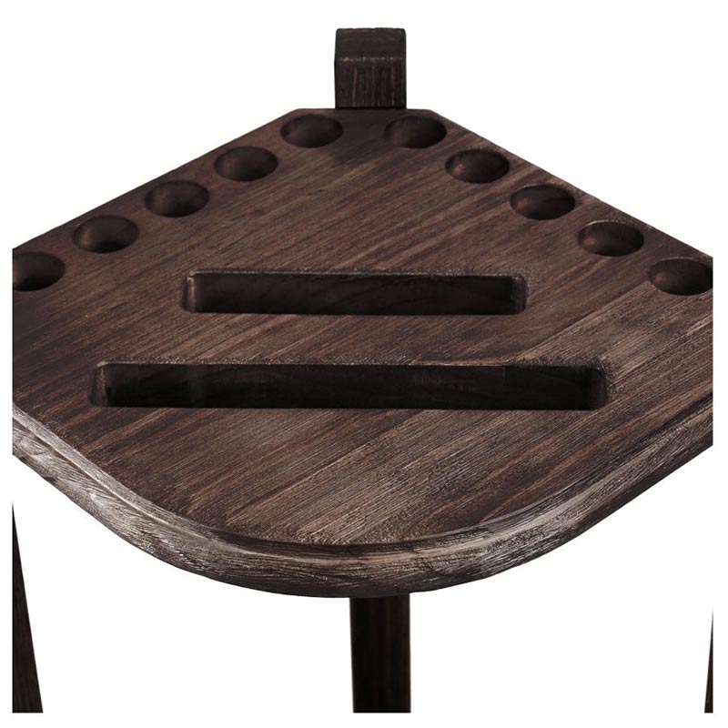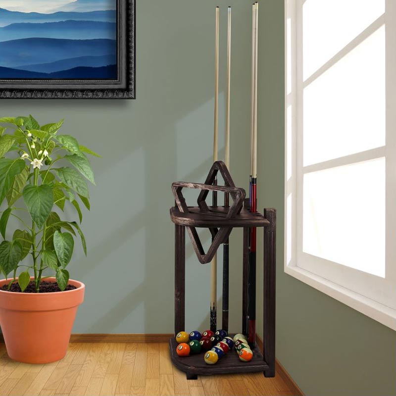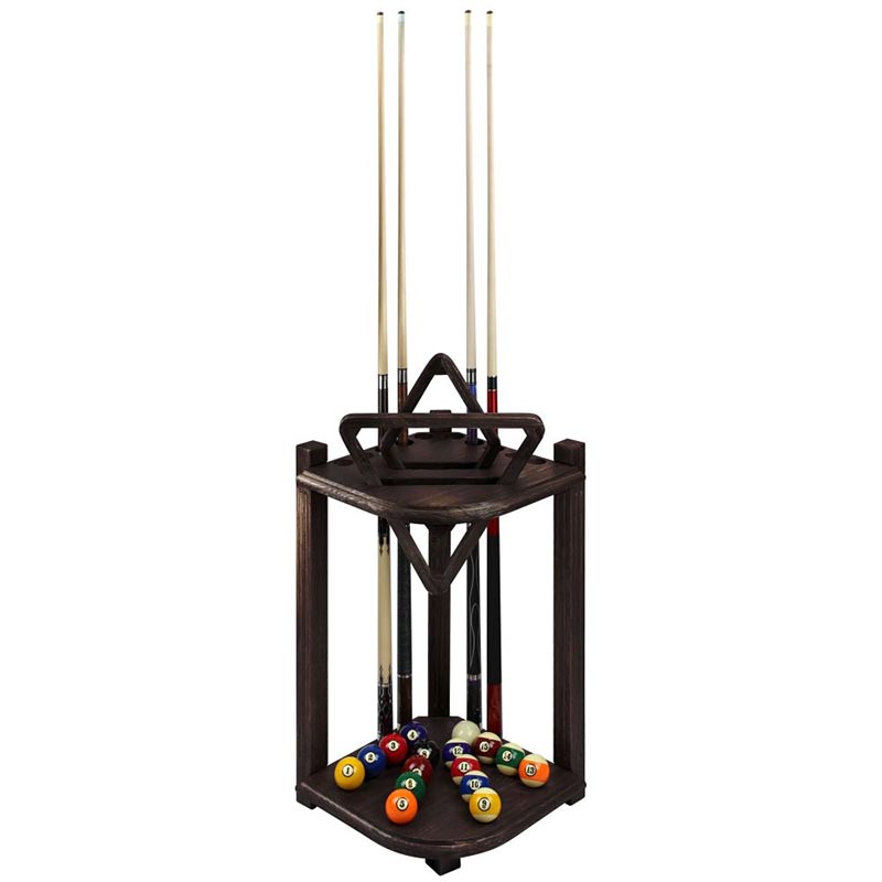 Solid wood corner cue rack with double thick design and a Desert Chestnut finish. The top of the rack has slots to hold the triangle and 9 ball rack. Measures 15″ x 15″ x 28″ high. Holds a set of balls and 10 cues. Unassembled. Matches the Reno tables.