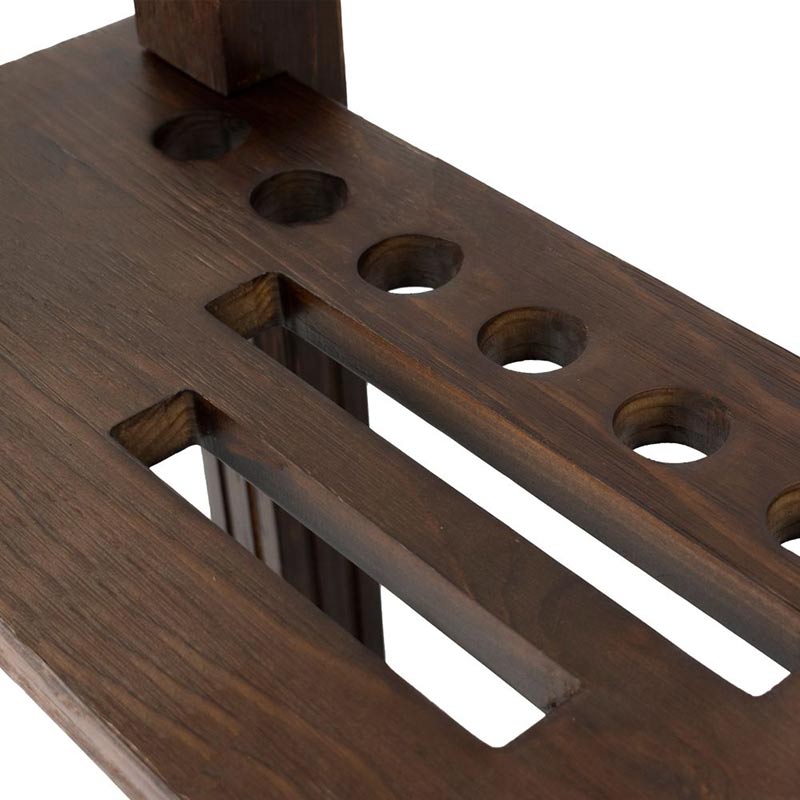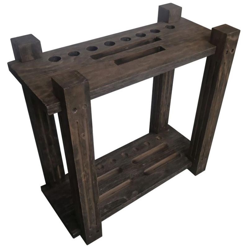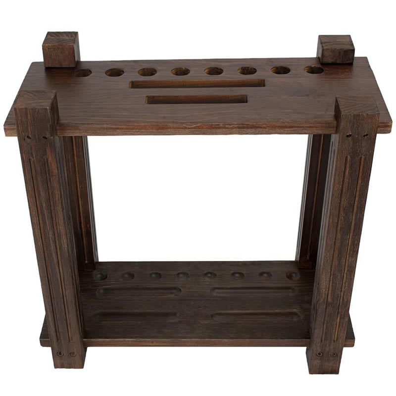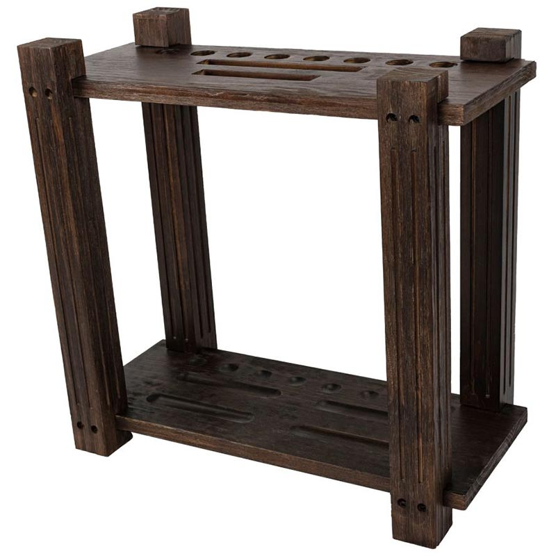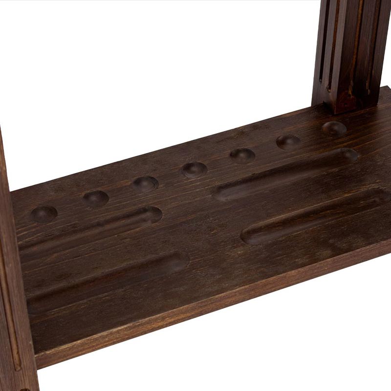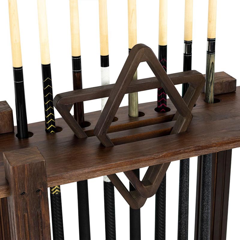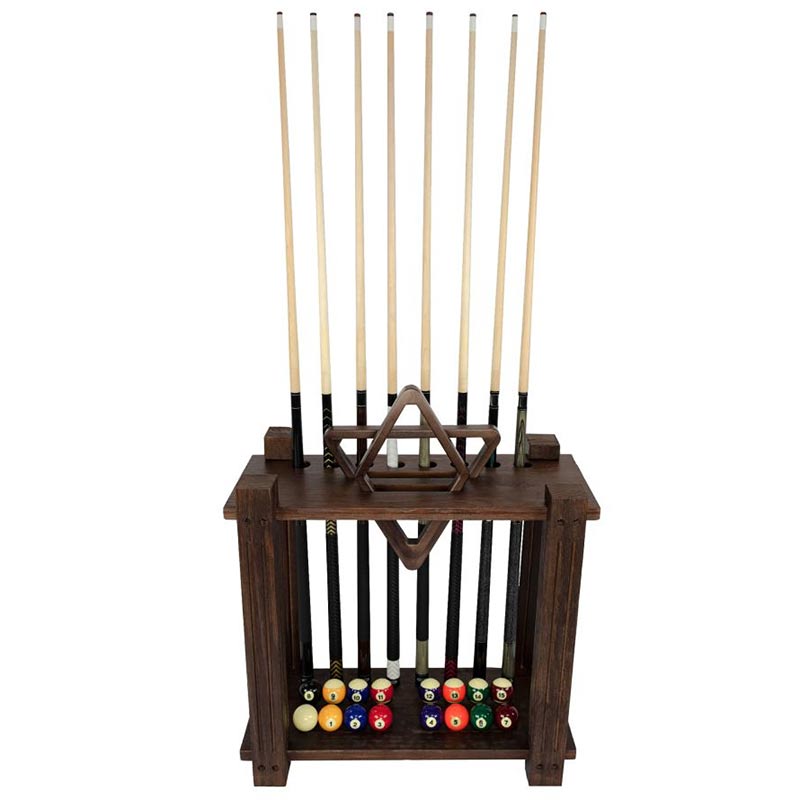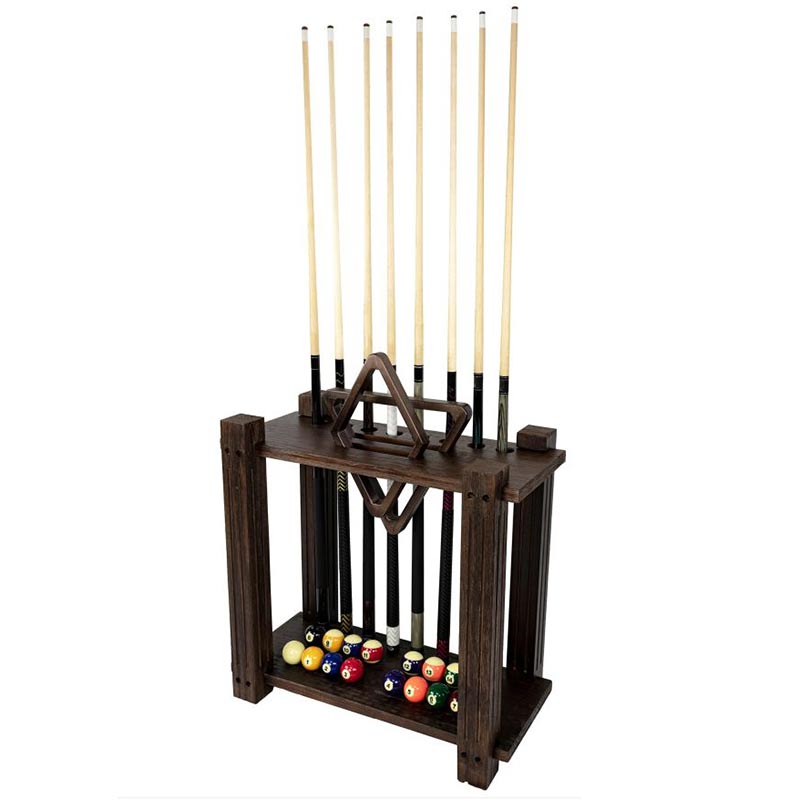 The Weathered Dark Chestnut rectangle floor rack can hold 8 cues, a 9-ball rack, a triangle, and a set of balls. It is a great way to store and organize game equipment. It can be placed anywhere along a wall or in a corner within easy reach of the pool table.