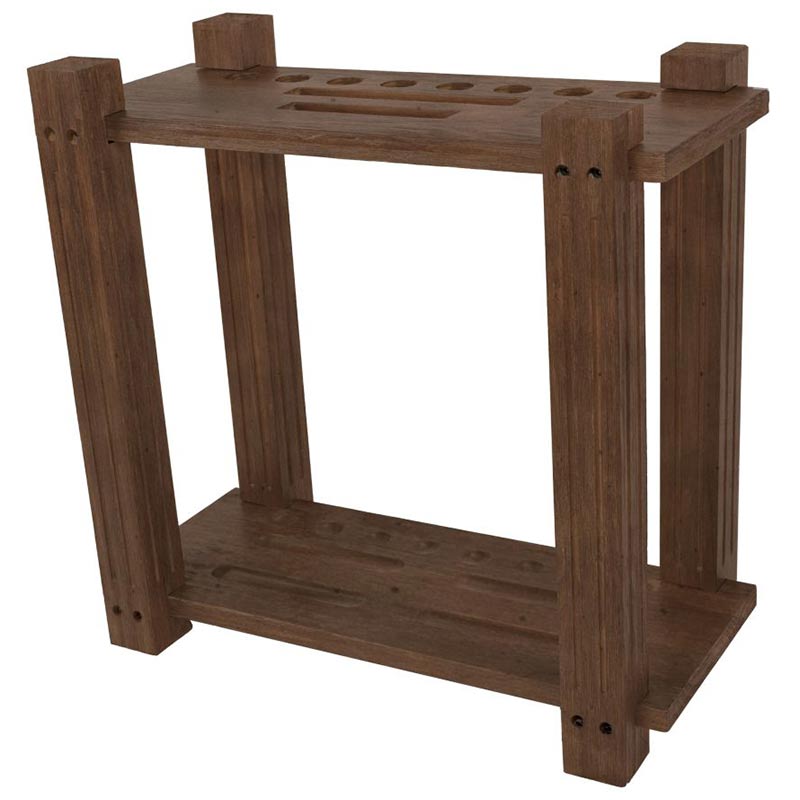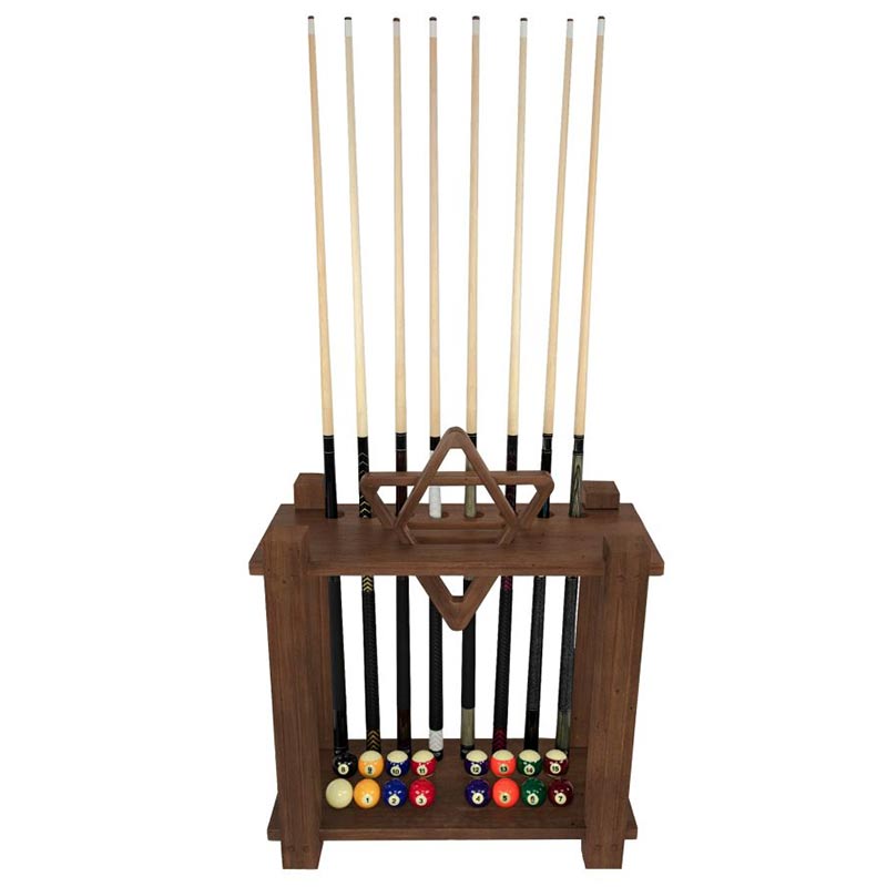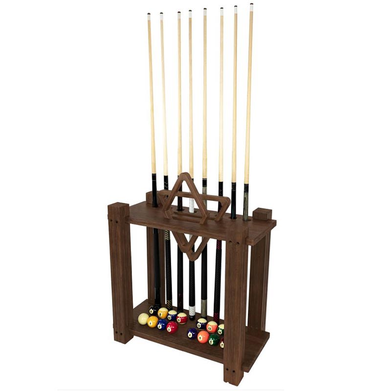 The Whiskey rectangle floor rack can hold 8 cues, a 9-ball rack, a triangle, and a set of balls. It is a great way to store and organize game equipment. It can be placed anywhere along a wall or in a corner within easy reach of the pool table.