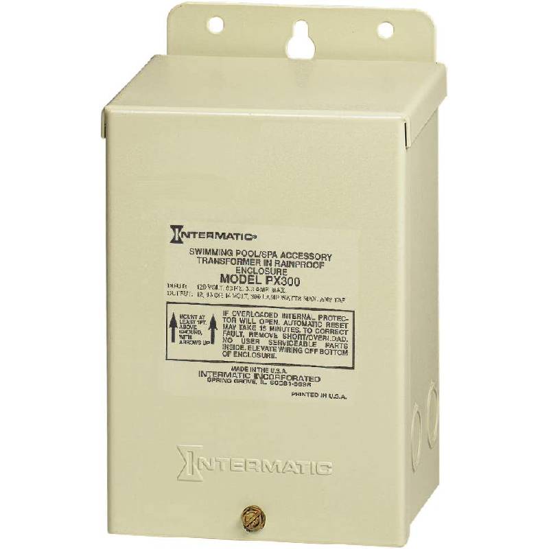 The Intermatic PX300S SS 300W Transformer Pool Lite is specifically designed to supply 12-14 VAC to pool & spa lights, submersible fixtures and outdoor garden lights. A grounded shield between the primary and secondary windings assures safe operation and the built-in circuit protection will disconnect power temporarily in case of overload. All comply with NEC Code 680.23 requirements for underwater luminaries.
