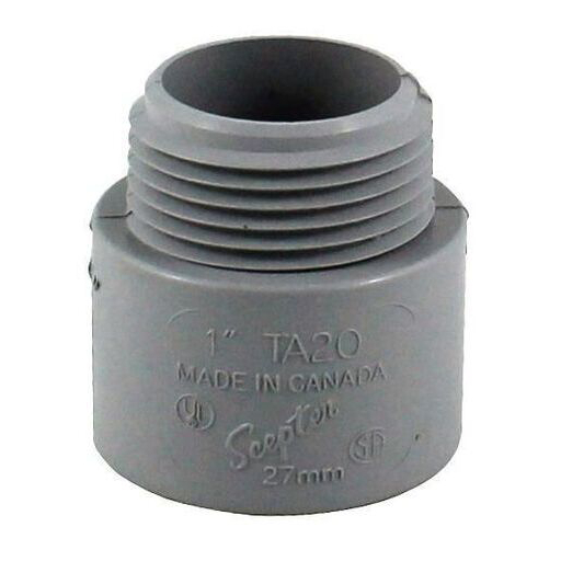 The Scepter Terminal Adapters are used to connect PVC conduit to a junction box or other threaded body.