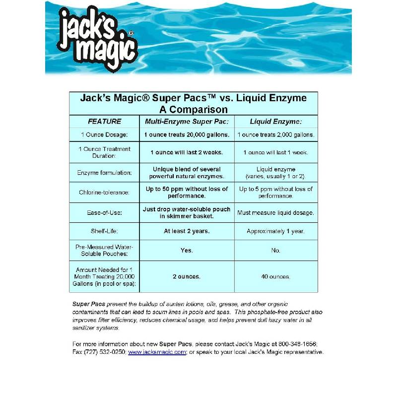 Jack’s Magic Natural Multi-Enzyme Super Packs are a unique blend of natural enzymes developed specifically for pools and spas. These super packs combine the high performance of powerful multi-enzyme action with the biodegradable features of a truly “green” product. These packs help break down oils, lotions, make up and other common organic pool and spa contaminants, preventing scum line build up and dull cloudy water.