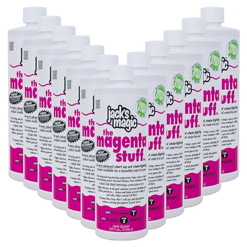 Jack’s Magic JMMAGENTA032 1 Quart The Magenta Stuff is a versatile and powerful sequestrant designed to prevent and remove metal stains and scale buildup in your pool. This product works effectively in various water conditions, ensuring your pool remains clear and free of unsightly stains. Each case contains 12 bottles, providing a sufficient supply for regular maintenance. Easy to use, simply add the recommended amount to your pool water. Maintain a pristine and inviting pool with Jack’s Magic The Magenta Stuff.