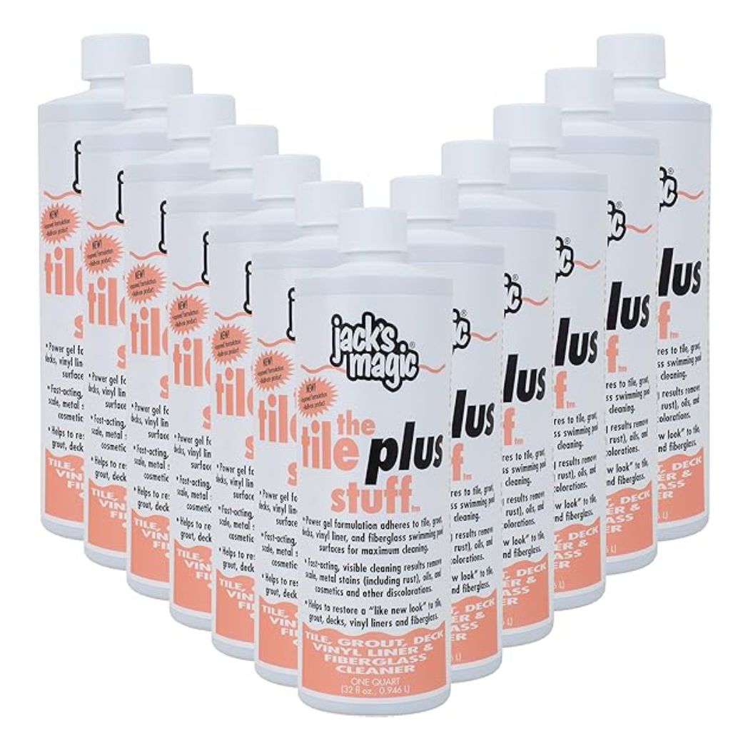Jack’s Magic JMTILE032 1 Quart The Tile Plus Stuff is a powerful cleaner specifically designed for pool tiles. This product effectively removes tough stains, scale, and calcium buildup, restoring the original shine of your tiles. Each case contains 12 one-quart bottles, making it perfect for regular maintenance. Easy to use, simply apply to the tiles, scrub lightly, and rinse for immediate results. Keep your pool tiles looking brand new with Jack’s Magic The Tile Plus Stuff.