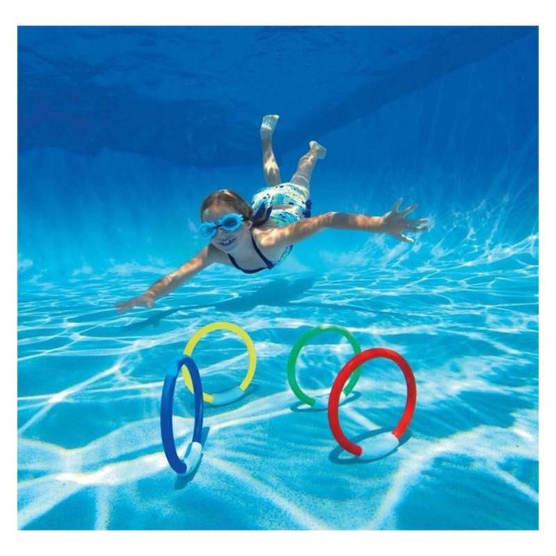 - Dive rings are specially weighted to stand upright on swimming pool bottom.