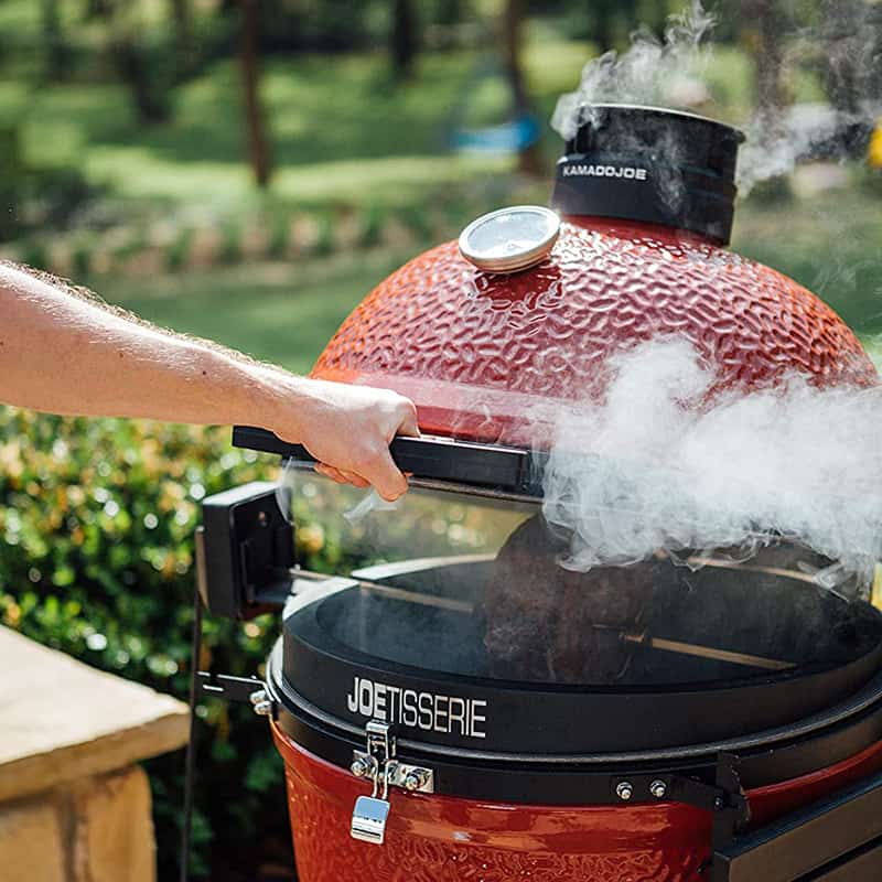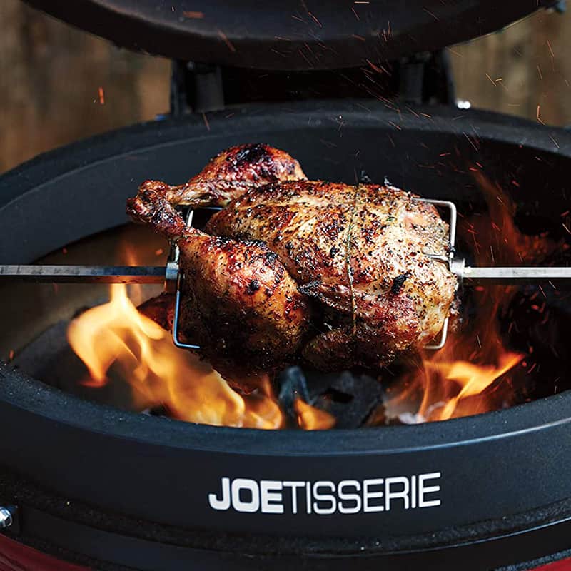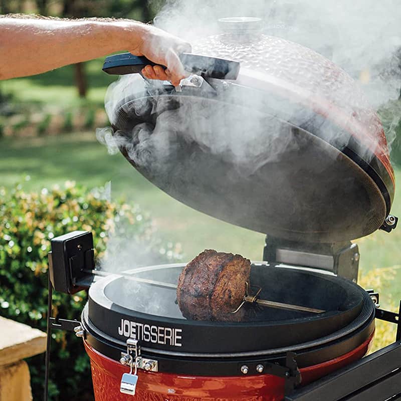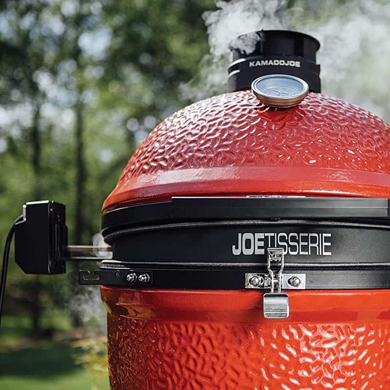 The durable cast aluminum Kamado Joe Joetisserie Classic transforms the Kamado Joe Classic into a new kind of spit, harnessing the self-basting action of a rotisserie inside the Kamado Joe’s signature high-fire ceramic body for meats that are smoky, juicy and tender. With a quiet-but-powerful 120-Volt motor that can spin up to 50 lbs. of chicken, prime rib, or Boston butt, the innovative Joe Tisserie features a distinctive wedge shape so cooks can seal off the kamado dome for optimal heat retention. The durable spit rod is easy to install and features quickly adjustable forks for excellent balance, and the constant, steady rotation preserves the meat’s natural juices for an even cook. This fits the Classic.